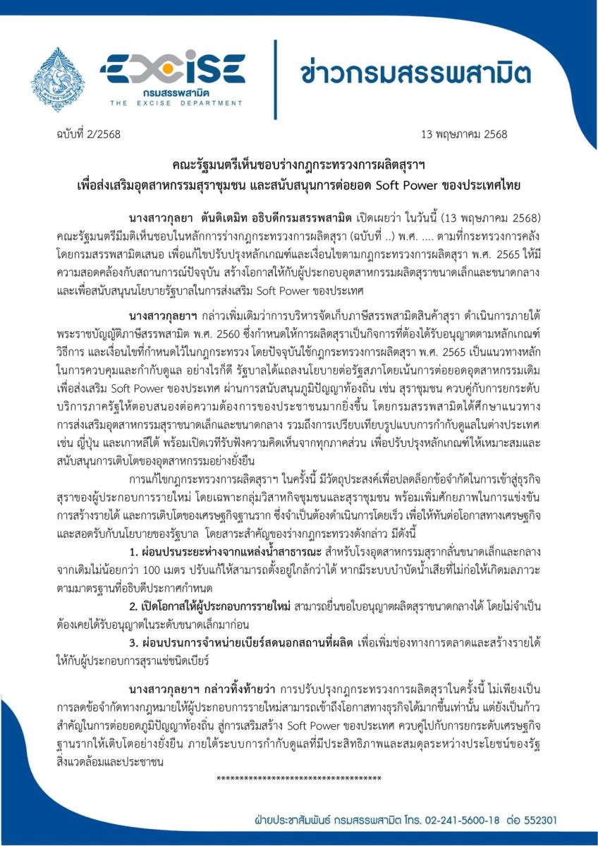 (13 พ.ค.68) นางสาวกุลยา ตันติเตมิท อธิบดีกรมสรรพสามิต เปิดเผยว่า ในวันนี้ (13 พฤษภาคม 2568) คณะรัฐมนตรีมีมติเห็นชอบในหลักการร่างกฎกระทรวงการผลิตสุรา (ฉบับที่ ..) พ.ศ. .... ตามที่กระทรวงการคลัง โดยกรมสรรพสามิตเสนอ เพื่อแก้ไขปรับปรุงหลักเกณฑ์และเงื่อนไขตามกฎกระทรวงการผลิตสุรา พ.ศ. 2565 ให้มีความสอดคล้องกับสถานการณ์ปัจจุบัน สร้างโอกาสให้กับผู้ประกอบอุตสาหกรรมผลิตสุราขนาดเล็กและขนาดกลางและเพื่อสนับสนุนนโยบายรัฐบาลในการส่งเสริม Soft Power ของประเทศ