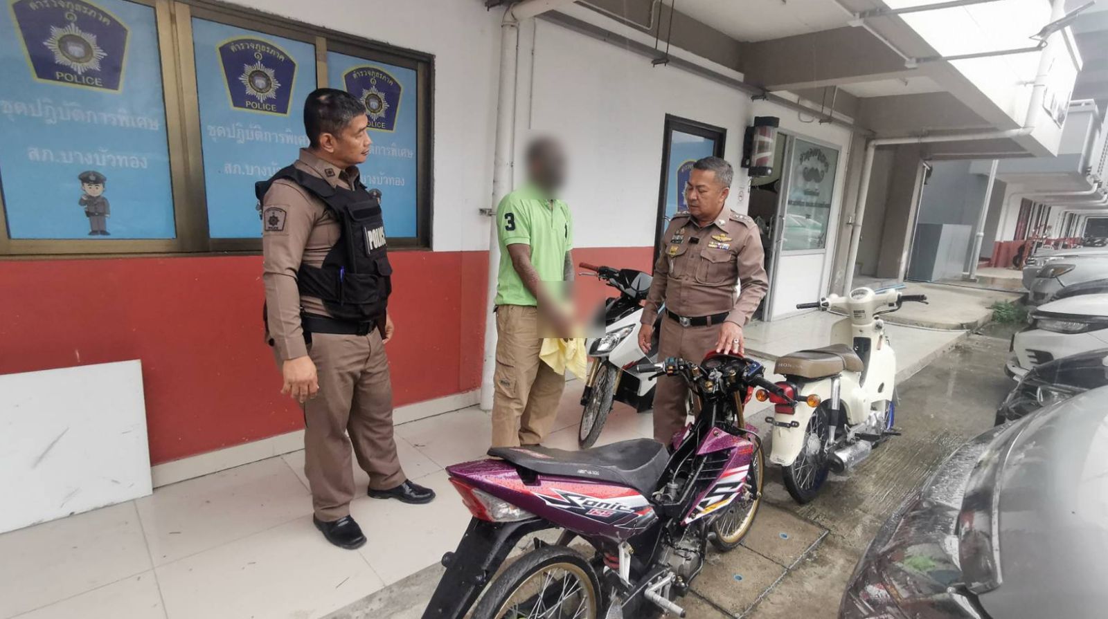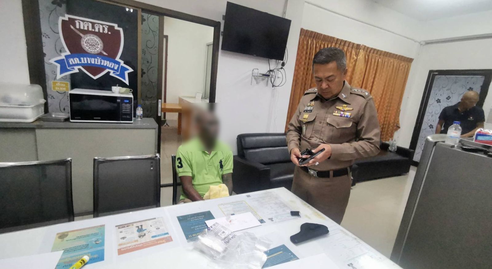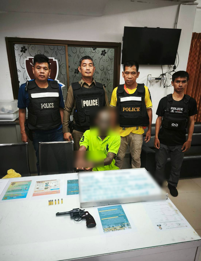 14 พฤษภาคม 2568 พ.ต.อ.พฤฒ จำรูญศาสน์ ผกก.สภ.บางบัวทอง พ.ต.ท.ชนาธิป พานทอง รอง ผกก.ป.บางบัวทอง พ.ต.ท.สีน้ำ นิยมพลอย สว.(สอบสวน) สภ.บางบัวทอง ร.ต.อ.สุรเขต วิเศษนคร รอง สวป.สภ.บางบัวทอง พร้อม ชุดปฏิบัติการพิเศษ (ไล่ล่า) สภ.บางบัวทอง ร่วมกันจับกุมตัว นายสอ. (นามสมมุติ) อายุ 45 ปี ตามหมายจับศาลจังหวัดนนทบุรีที่ ค342/2568 พร้อมด้วยของกลาง คือ 1.อาวุธปืน ลูกโม่ COLT ขนาด .32 จำนวน 1 กระบอก, 2.เครื่องกระสุนปืน ขนาด .32 จำนวน 5 นัด, และ 3.ยาเสพติดให้โทษประเภท 1 ประเภท (ยาบ้า) บรรจุอยู่ในถุงพลาสใส แบบรดเปิด-ปิด จำนวน 1 ถุง มียาบ้าจำนวน 2 เม็ด