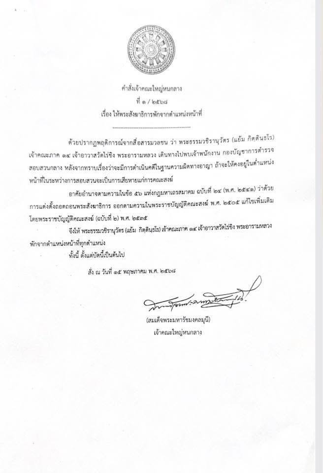 จึงได้อาศัยอำนาจตามความในข้อ 56 แห่งกฎมหาเถรสมาคม ฉบับที่ 24 (พ.ศ. 2553) ว่าด้วยการแต่งตั้งถอดถอนพระสังฆาธิการ ออกตามความในพระราชบัญญัติคณะสงฆ์ พ.ศ. 2505 แก้ไขเพิ่มเดิมโดยพระราชบัญญัติคณะสงน์ (ฉบับที่ 2) พ.ศ. 2535 ให้เหตุผลว่า ถ้าจะให้คงอยู่ในตำแหน่งหน้าที่ในระหว่างการสอบสวนจะเป็นการเสียหายแก่การคณะสงฆ์