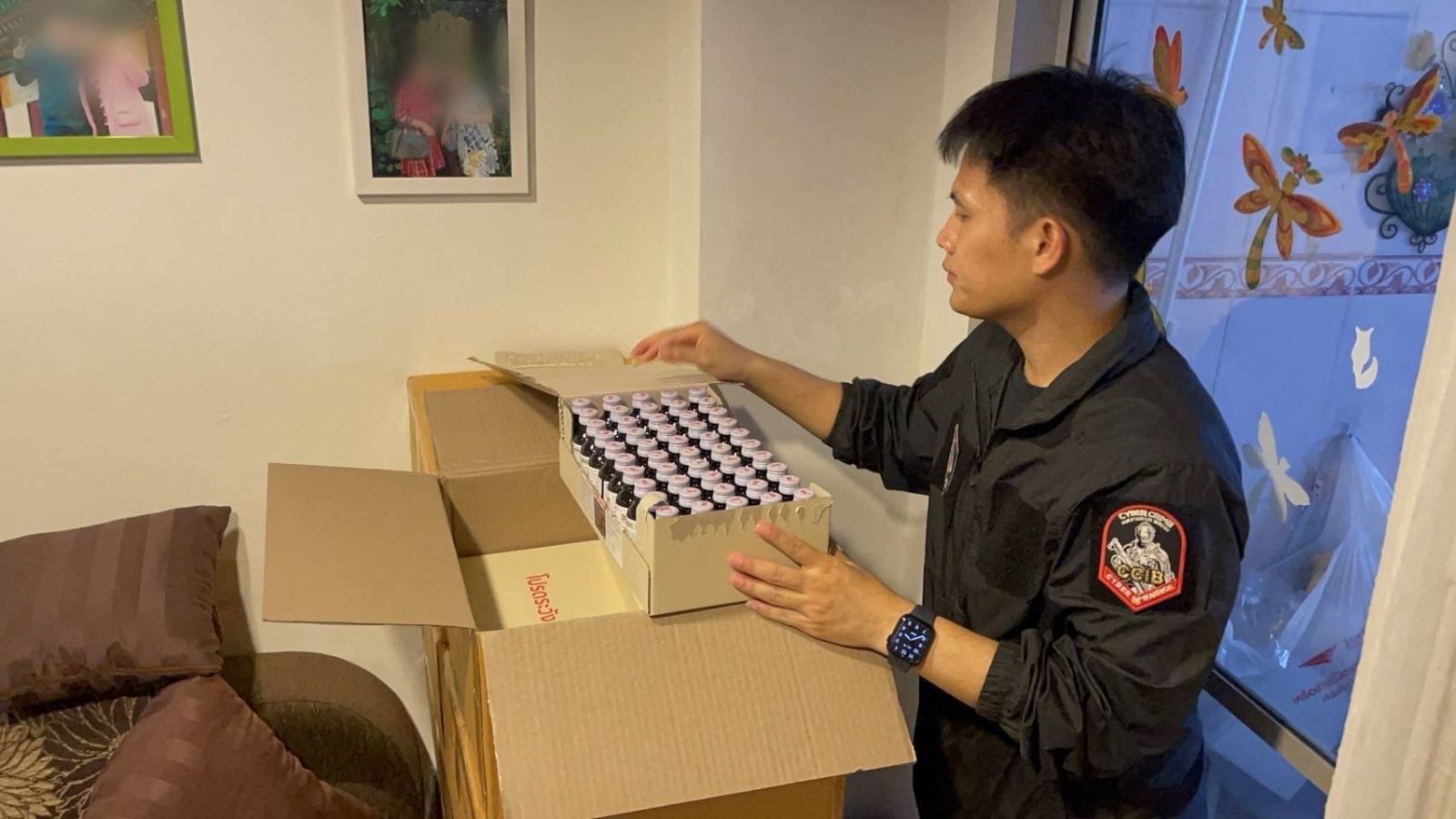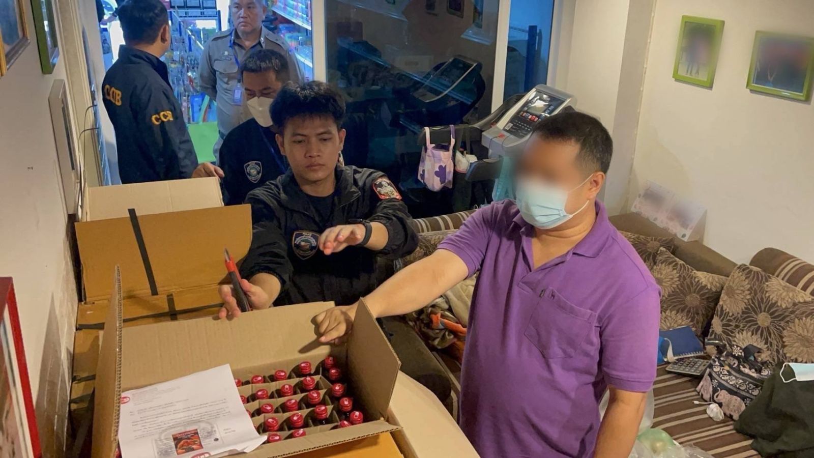 จากการตรวจค้น พบชาย อายุ 39 ปี พร้อมด้วยยาแก้ไอบรรจุอยู่ในลังกระดาษรวมทั้งสิ้น จำนวน 7,600 ขวดอยู่ภายในห้องพัก และวางกระจายอยู่ในจุดต่าง ๆ ภายในร้านค้าดังกล่าว จึงได้ตรวจยึดไว้เป็นของกลาง ประกอบด้วย