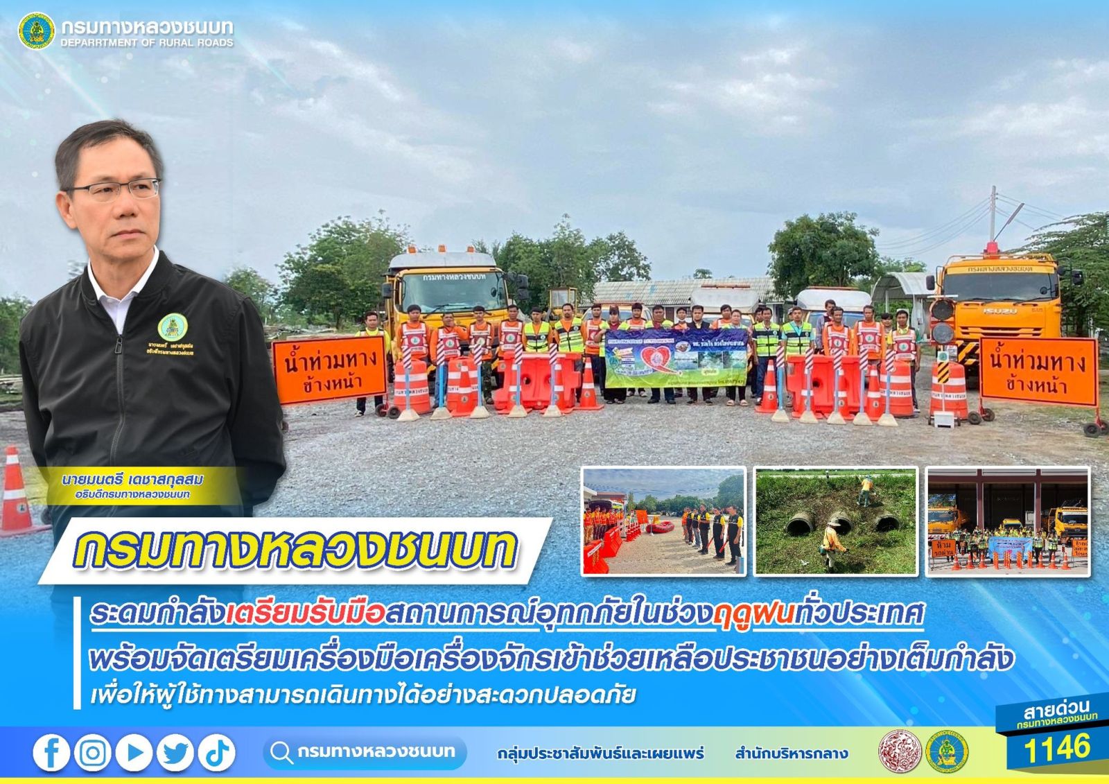 กรมทางหลวงชนบท ระดมกำลังเตรียมรับมือสถานการณ์อุทกภัย ช่วงฤดูฝนทั่วประเทศ พร้อมจัดเตรียมเครื่องมือเครื่องจักรเข้าช่วยเหลือประชาชนอย่างเต็มกำลัง เพื่อให้ผู้ใช้ทางสามารถเดินทางได้อย่างสะดวกปลอดภัย