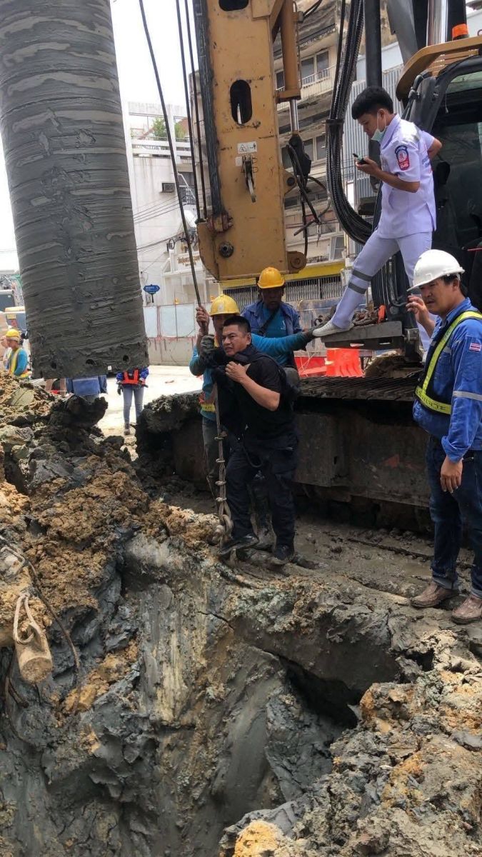 จากการสอบถาม นายชาติ อายุ 41 ปี สัญชาติกัมพูชา เพื่อนร่วมงาน กล่าวว่า ขณะเกิดเหตุทำงานกันอยู่ 5-6 คน ส่วนผู้ที่ตกลงไปในหลุม ตนทราบว่าชื่อ นายศราวุธ ชาว จ.ศรีสะเกษ มีตำแหน่งเป็นพนักงานทั่วไปและเป็นคนขับรถด้วย มาทำงานได้เพียง 10 กว่าวัน ขณะกำลังถอนเข็มเก่าออก แล้วยิงน้ำปูนลงไป และใกล้จะพัก จู่ ๆ ดินเกิดสไลด์ลงไปในบ่อ ทำให้ผู้ติดค้างตกลงไปด้านล่าง ความลึกประมาณ 19 เมตร ตนตกใจทำอะไรไม่ถูก จังหวัดที่นายศราวุธ จะหล่นลงไปดินขี้เลนปากบ่อที่ขุดไว้เกิดสไลด์ทำให้นายสราวุธตกลงไปด้วย และดินกลบลงไป ยอมรับว่าก่อนเพิ่งเคยเจอเหตุการณ์ลักษณะนี้ครั้งแรก