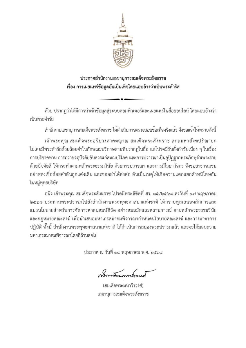 (19 พ.ค.68) จากกรณีมีเพจเฟซบุ๊กหนึ่ง ได้โพสต์ข้อความระบุว่า “สมเด็จพระสังฆราชทรงรับสั่งให้ประชาชนงดเอาเงินถวายพระโดยเด็ดขาดแม้กระทั่งงานศพงดใส่ซองขาวถวายพระ สาธุ” กระทั่งมีผู้แชร์ออกไปจำนวนมาก