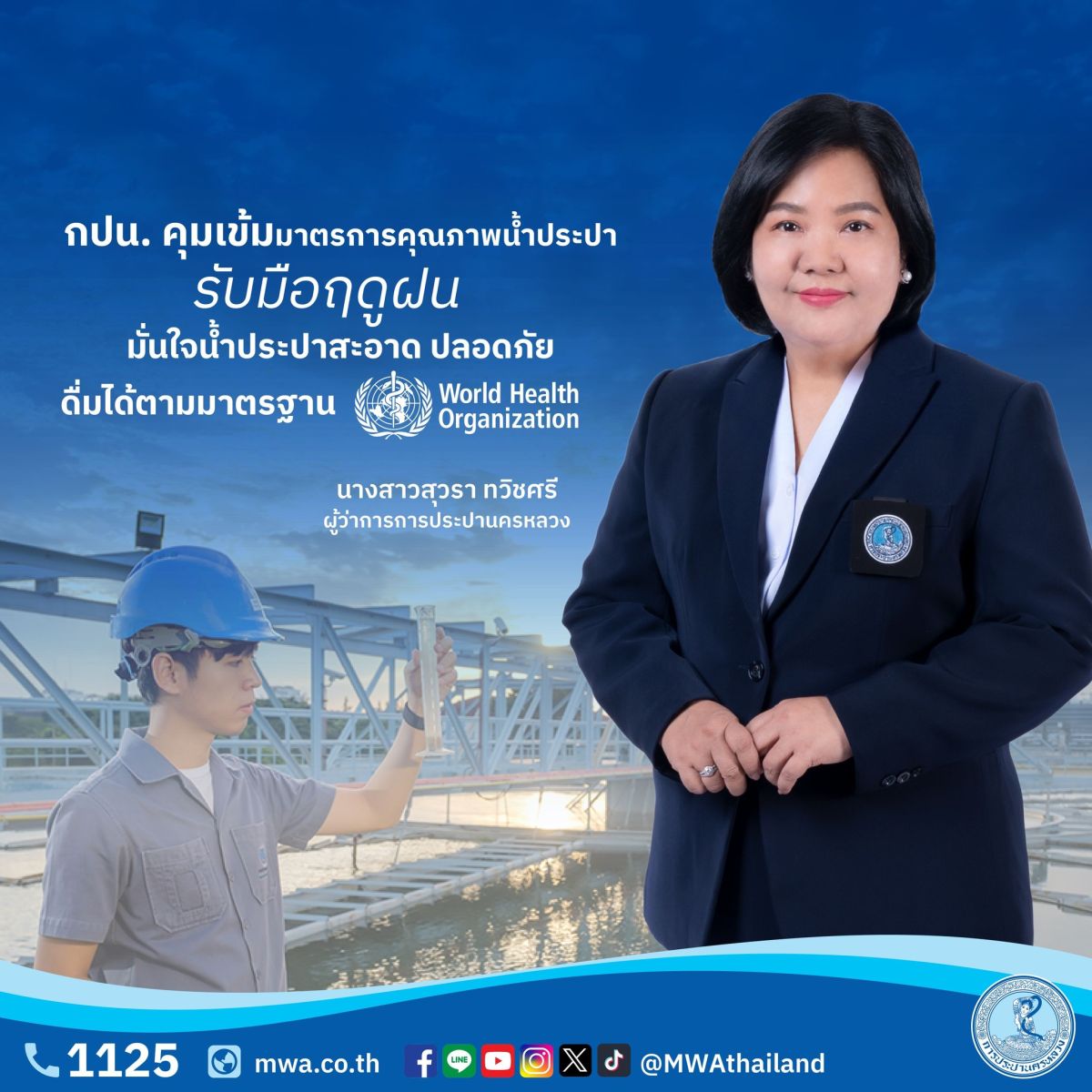 นางสาวสุวรา ทวิชศรี ผู้ว่าการการประปานครหลวง (กปน.) เปิดเผยว่า ตามที่กรมอุตุนิยมวิทยาประกาศให้ประเทศไทยเข้าสู่ฤดูฝนอย่างเป็นทางการเมื่อวันที่ 15 พฤษภาคมที่ผ่านมา กปน. ได้ดำเนินการเพิ่มมาตรการเฝ้าระวัง และควบคุมคุณภาพน้ำประปาในทุกขั้นตอน ตั้งแต่การตรวจสอบคุณภาพแหล่งน้ำดิบ กระบวนการผลิต ไปจนถึงระบบสูบจ่ายน้ำ เพื่อให้มั่นใจว่าน้ำประปาที่ส่งถึงประชาชนมีความสะอาด ปลอดภัย และสามารถดื่มได้ตามมาตรฐานขององค์การอนามัยโลก (WHO) ทั้งนี้ ในช่วงฤดูฝนแหล่งน้ำดิบอาจได้รับผลกระทบจากดินตะกอนที่อาจไหลปะปนมากับน้ำฝน กปน. จึงได้เฝ้าระวังตรวจสอบคุณภาพน้ำดิบอย่างใกล้ชิด โดยทีมนักวิทยาศาสตร์ได้มีการติดตามและวิเคราะห์คุณภาพน้ำด้วยการตรวจวัดค่าพารามิเตอร์ที่สำคัญ เช่น ความขุ่น รสและกลิ่น คุณลักษณะทางเคมี จุลชีววิทยา การปนเปื้อนต่าง ๆ รวมถึงการควบคุมปริมาณคลอรีนคงเหลือพร้อมปรับกระบวนการผลิตให้สอดคล้องกับสภาพน้ำในแต่ละช่วงเวลา เพิ่มความถี่ในการตรวจสอบคุณภาพน้ำตลอดกระบวนการ รวมทั้งการบำรุงรักษาอุปกรณ์การผลิต และระบบจ่ายน้ำอย่างต่อเนื่อง และจัดเตรียมแผนฉุกเฉินเพื่อรับมือกับสถานการณ์ฉุกเฉินที่อาจเกิดขึ้นได้
