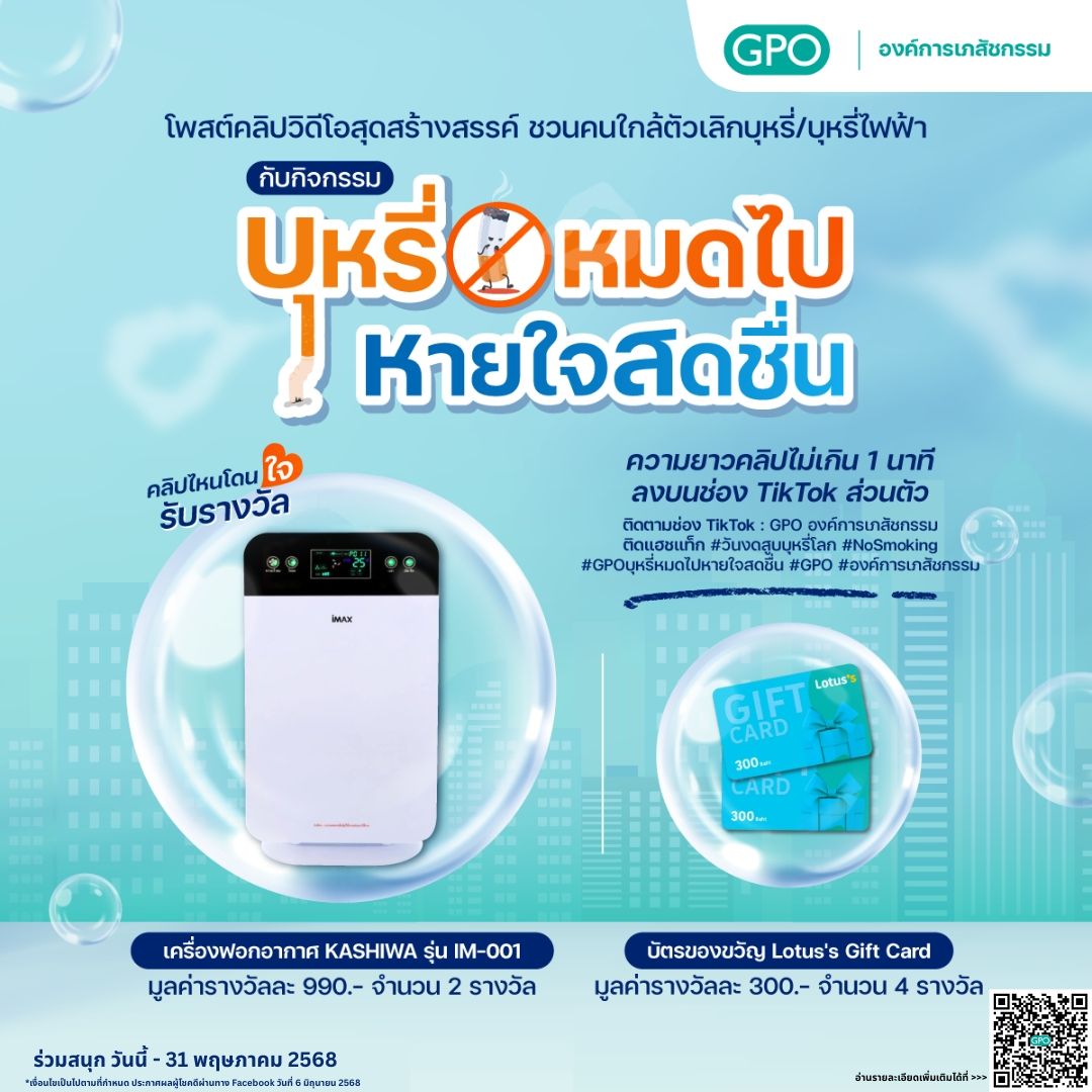องค์การเภสัชกรรม เชิญร่วมสนุกกับกิจกรรม "บุหรี่หมดไป หายใจสดชื่น" เพียงโพสต์ คลิปวิดีโอสั้นๆ ชวนคนใกล้ตัวเลิกบุหรี่/บุหรี่ไฟฟ้า ลุ้นรับรางวัลกว่า 3,000 บาท