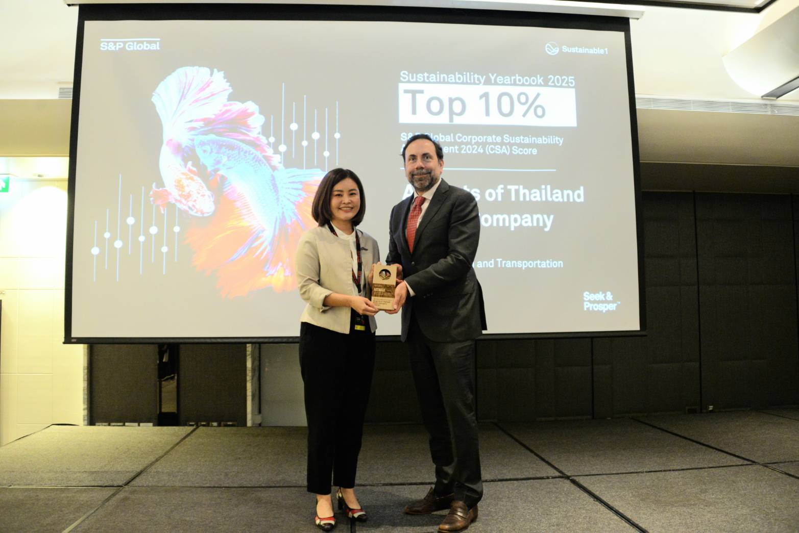 นางสาวปวีณา จริยฐิติพงศ์ รักษาการผู้อำนวยการใหญ่ บริษัท ท่าอากาศยานไทย จำกัด (มหาชน) (AOT) เป็นผู้แทน AOT รับมอบโล่และประกาศเกียรติคุณในงาน S&P Global Sustainability Yearbook 2025 Distinction Ceremony in Bangkok ณ โรงแรม Marriott Marquis Queen’s Park เมื่อ 20 พฤษภาคม 2568 โดยเป็นการประกาศเกียรติคุณจาก S&P Global ในฐานะที่ AOT ได้รับการประเมินคะแนนสูงสุดเป็นอันดับ 2 ใน S&P Global Corporate Sustainability Assessment (CSA) Score 2024 ด้านความยั่งยืน ประเภทกลุ่มอุตสาหกรรมคมนาคมและโครงสร้างพื้นฐานด้านคมนาคม (Transportation and Transportation Infrastructure: TRA) และอยู่ใน 10% แรกของบริษัทที่มีกลุ่มคะแนนสูงสุดจากบริษัทที่เข้าร่วมการประเมิน โดยในปี 2024 มีผู้เข้ารับการประเมิน 7,690 บริษัทจาก 62 อุตสาหกรรมทั่วโลก