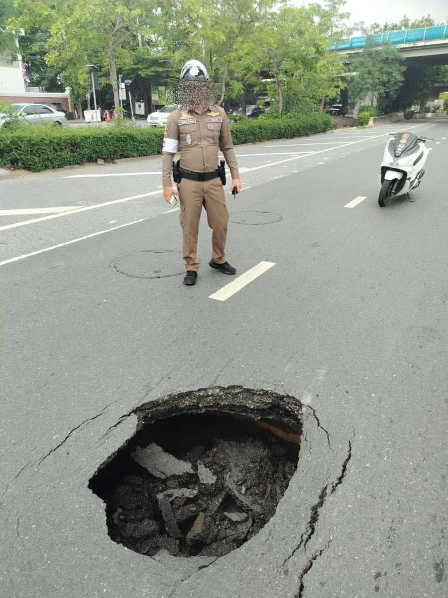 20 พ.ค. 2568 เวลา 16.50 น. รับแจ้งเหตุพื้นถนนชำรุดทรุดตัว หน้าโรงเรียนนานาชาติฮีทฟิลด์ ถนนรามคำแหง ขาเข้า (ระหว่างแยกวงแหวนตัดรามคำแหง มุ่งหน้าแยกคลองเจ๊ก) แขวงราษฎร์พัฒนา เขตสะพานสูง กรุงเทพมหานคร เป็นหลุมโพรงไม่ทราบความลึก กว้างประมาณ 1 เมตร ในช่องทางจราจรที่ 2 จากช่องทางซ้าย พื้นที่ สน.บางชัน