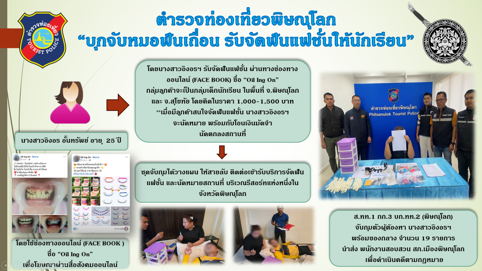 การจับกุมครั้งนี้ สืบเนื่องจากเจ้าหน้าที่ตำรวจท่องเที่ยวได้เบาะแสว่ามีผู้ลักลอบนำสินค้าอุปกรณ์จัดฟันแฟชั่นมาจำหน่ายพร้อมให้บริการจัดฟัน ให้กับกลุ่มเด็กนักเรียนพื้นที่พิษณุโลกและสุโขทัย โดยมีการโฆษณาผ่านสื่อสังคมออนไลน์เฟซบุ๊ก เจ้าหน้าที่จึงได้วางแผนให้สายลับติดต่อเข้ารับบริการจัดฟันแฟชั่นในราคา 1,000-1,500 บาท โอนเงินมัดจำไปยังบัญชีธนาคาร พร้อมนัดเข้ารับบริการจัดฟันแฟชั่นตามสถานที่นัดหมาย จนนำมาสู่การจับกุมพร้อมของกลางดังกล่าว