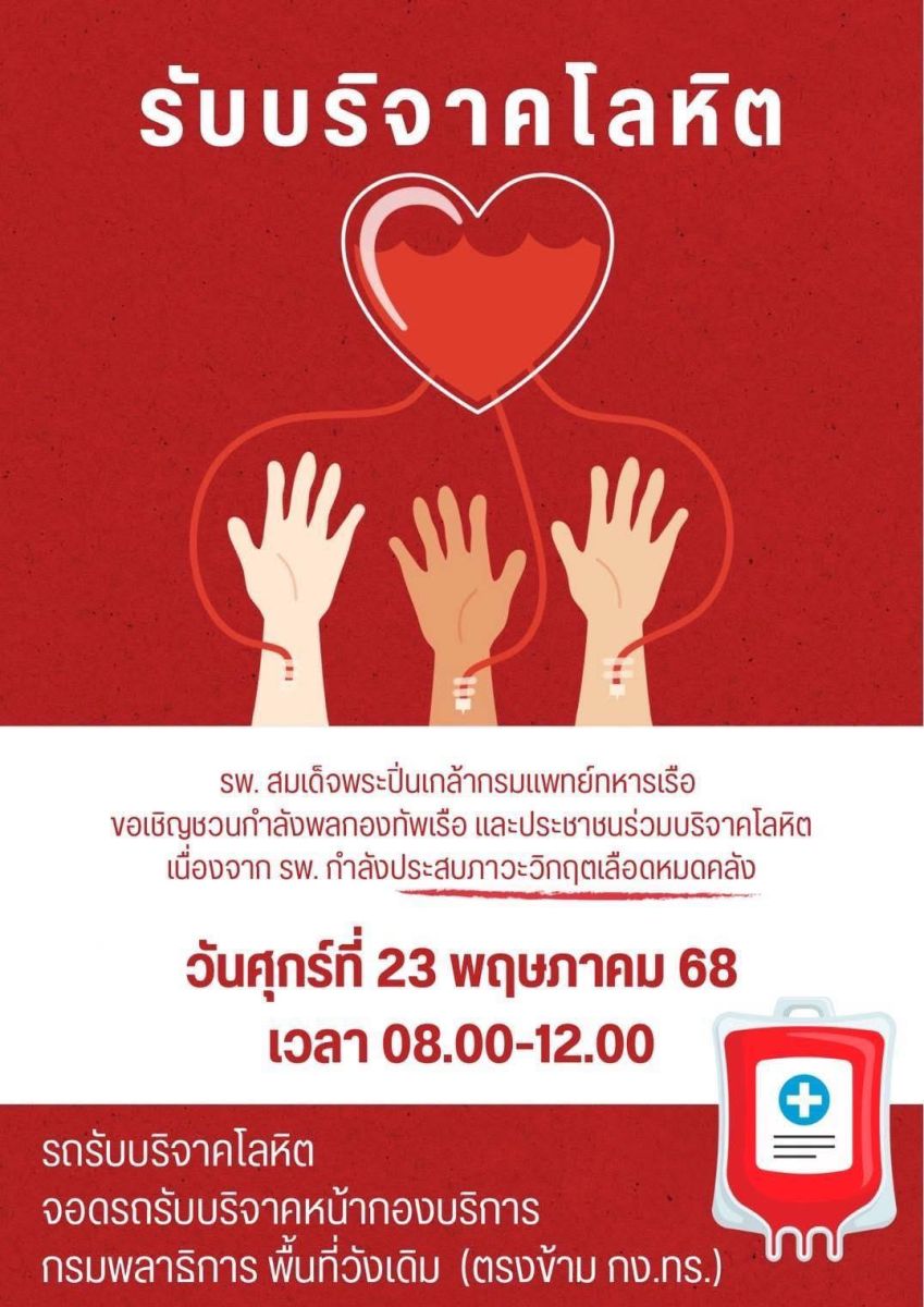 เนื่องจาก โรงพยาบาลสมเด็จพระปิ่นเกล้า กรมแพทย์ทหารเรือ กำลังประสบภาวะวิกฤตเลือดหมดคลัง จึงขอเชิญชวนกำลังพลกองทัพเรือ และประชาชนร่วมบริจาคโลหิตกับรถรับบริจาคโลหิตเคลื่อนที่กับโรงพยาบาล ในวันศุกร์ที่ 23 พฤษภาคม 2568 เวลา 08.00-12.00 น.