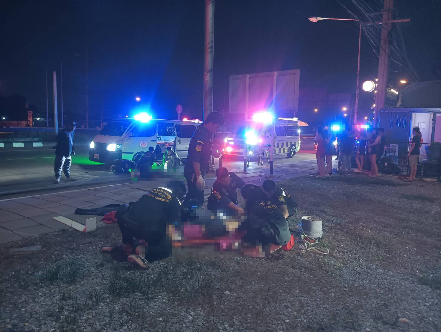 รถจักรยานยนต์ชนคนเร่ร่อนเดินริมถนนบาดเจ็บสาหัส ส่วนผู้ขับขี่เสียชีวิตในเวลาต่อมา ถนนกาญจนาภิเษก จ.นนทบุรี