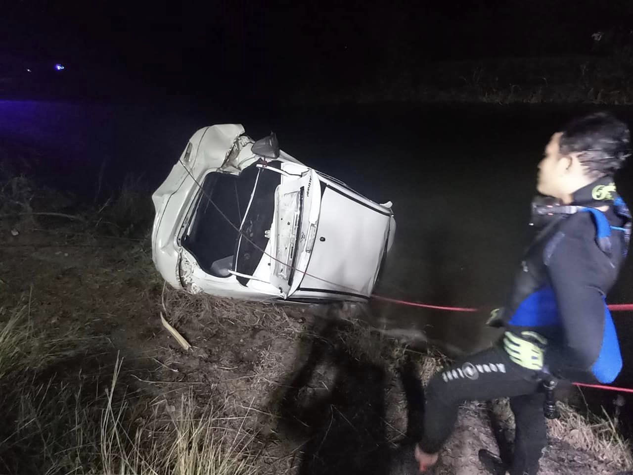 รถเก๋ง เสียหลักพุ่งลงคลอง คนขับเสียชีวิตติดค้างในยานพาหนะ จนท.งมร่างนำขึ้นฝั่ง