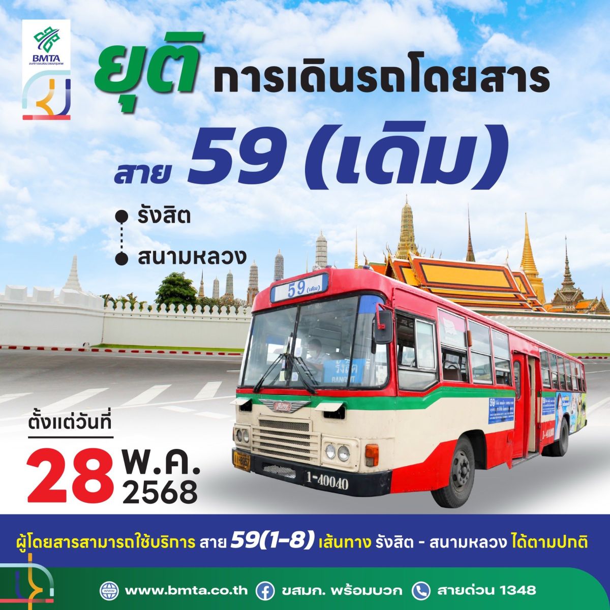 ขสมก. ขอแจ้งให้ประชาชนผู้ใช้บริการทราบว่า ขสมก. จำเป็นต้องหยุดให้บริการเดินรถโดยสารประจำทางสาย 59 (เดิม) เส้นทาง รังสิต – สนามหลวง ตั้งแต่วันที่ 28 พฤษภาคม 2568 เป็นต้นไป เนื่องจากอายุใบอนุญาตเดินรถชั่วคราว ม.41 ได้สิ้นสุดลง ทั้งนี้ ขสมก. ยังคงให้บริการเส้นทางปฏิรูป สาย 59 (1-8) โดยมีรถโดยสารประจำการในเส้นทาง จำนวน 41 คัน แบ่งเป็นรถโดยสารธรรมดา จำนวน 26 คัน และ รถโดยสารปรับอากาศ (ยูโรทู) จำนวน 15 คัน เพื่อเชื่อมต่อการเดินทางอย่างไร้รอยต่อ และอำนวยความสะดวกปลอดภัยในการเดินทางให้กับประชาชนผู้ใช้บริการ