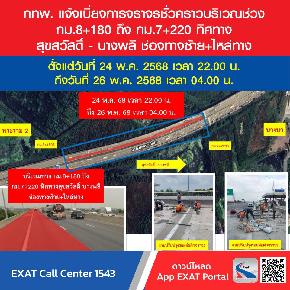 การทางพิเศษแห่งประเทศไทย (กทพ.) กระทรวงคมนาคม ได้ว่าจ้าง บริษัท ไทยวัฒน์วิศวการทาง จํากัด เป็นผู้รับจ้างดําเนินงานปรับปรุงผิวจราจรและรอยต่อทางพิเศษกาญจนาภิเษก (บางพลี - สุขสวัสดิ์) โดยผู้รับจ้าง จะเข้าดำเนินการปรับปรุงผิวจราจร และรอยต่อทางพิเศษกาญจนาภิเษก (บางพลี - สุขสวัสดิ์) จึงมีความจำเป็นจะต้องเบี่ยงการจราจรชั่วคราวบนทางพิเศษดังกล่าว บริเวณช่วง กม.8+180 ถึง กม.7+220 ทิศทางสุขสวัสดิ์ - บางพลี ช่องทางซ้าย+ไหล่ทาง ตั้งแต่วันที่ 24 พ.ค. 2568 เวลา 22.00 น. ถึงวันที่ 26 พ.ค. 2568 เวลา 04.00 น.