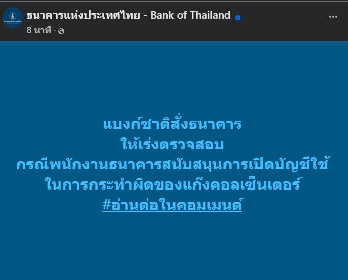 23 พฤษภาคม 2568 ภายหลัง พล.ต.อ. ธัชชัย ปิตะนีละบุตร จเรตำรวจแห่งชาติ ได้แถลงข่าวกรณีพนักงานธนาคารสนับสนุนการเปิดบัญชีที่ใช้ในการกระทำผิดของขบวนการคอลเซ็นเตอร์ และสามารถขยายผลไปยังผู้ร่วมขบวนการรายอื่นได้อีกหลายราย เมื่อวันพุธที่ 21 พฤษภาคม 2568 นั้น
