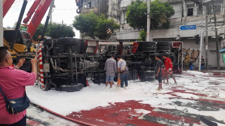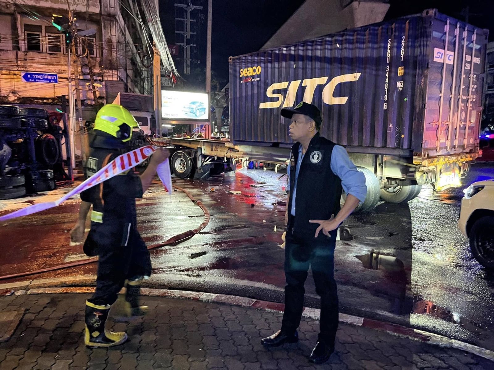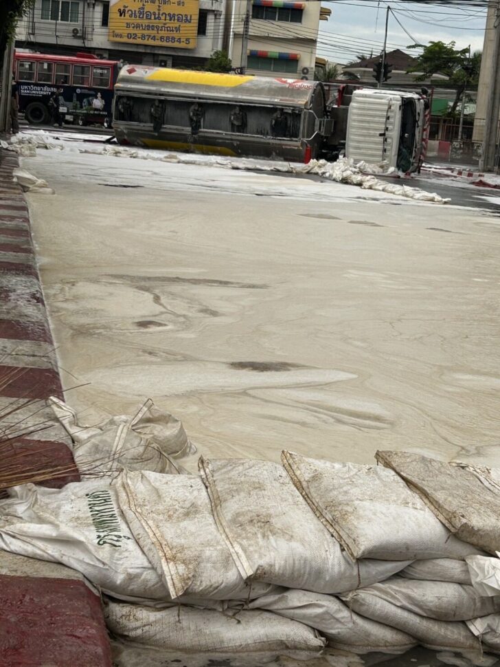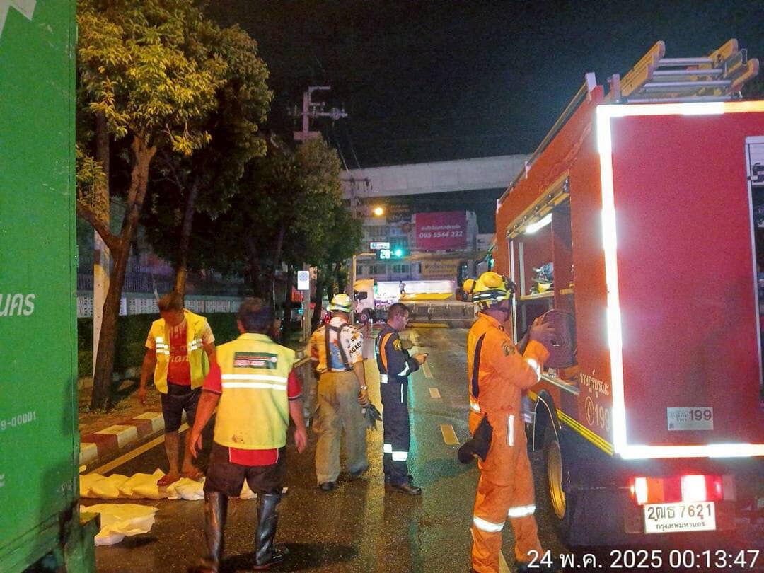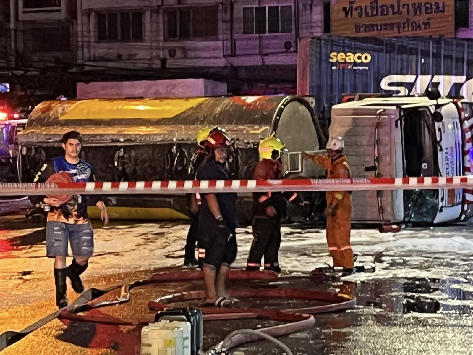 เมื่อเวลา 00.20 น. วันที่ 24 พฤษภาคม 2568 พ.ต.ต.ประยูร วิทยา สารวัตร(สอบสวน)สน.ราษฎร์บูรณะ รับแจ้งมีอุบัติรถบรรทุกพ่วง 22 ล้อพุ่งชนรถ 10 ล้อบรรทุกน้ำมันพลิกคว่ำ บริเวณแยกราษฎร์พัฒนา ตัดถนนสุขสวัสดิ์ แขวงบางปะกอก เขตราษฎร์บูรณะ กทม. จึงรุดไปตรวจสอบพร้อมประสานสถานีดับเพลิง และอาสาสมัครมูลนิธิป่อเต็กตึ๊ง
