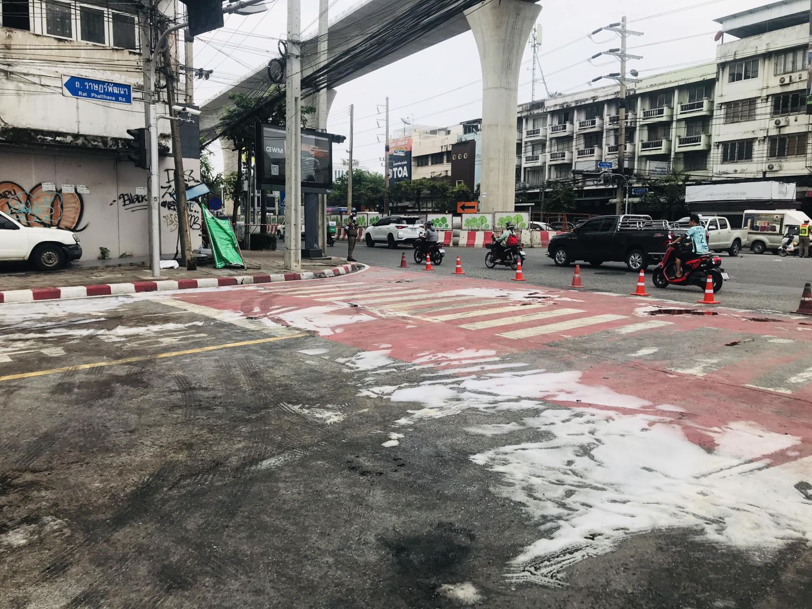 ที่เกิดเหตุพบรถบรรทุกพ่วง 22 ล้อตู้คอนเทนเนอร์ หมวดจังหวัดกทม.สภาพหน้ารถพังยับ ล้อหน้าเสยขึ้นฟุตปาธ ใกล้กันพบรถ 10 ล้อบรรทุกน้ำมัน หมวดทะเบียนพระนครศรีอยุธยา สภาพพลิกตะแคงกีดขวางกลางถนน ทำให้น้ำมันเบนซิน 16,000 ลิตร รั่วไหลเต็มพื้นถนนราษฎร์พัฒนา เจ้าหน้าที่จึงปิดการจราจรบริเวณดังกล่าว ก่อนใช้น้ำและน้ำยาโฟมฉีดเพื่อป้องกันเหตุเพลิงไหม้