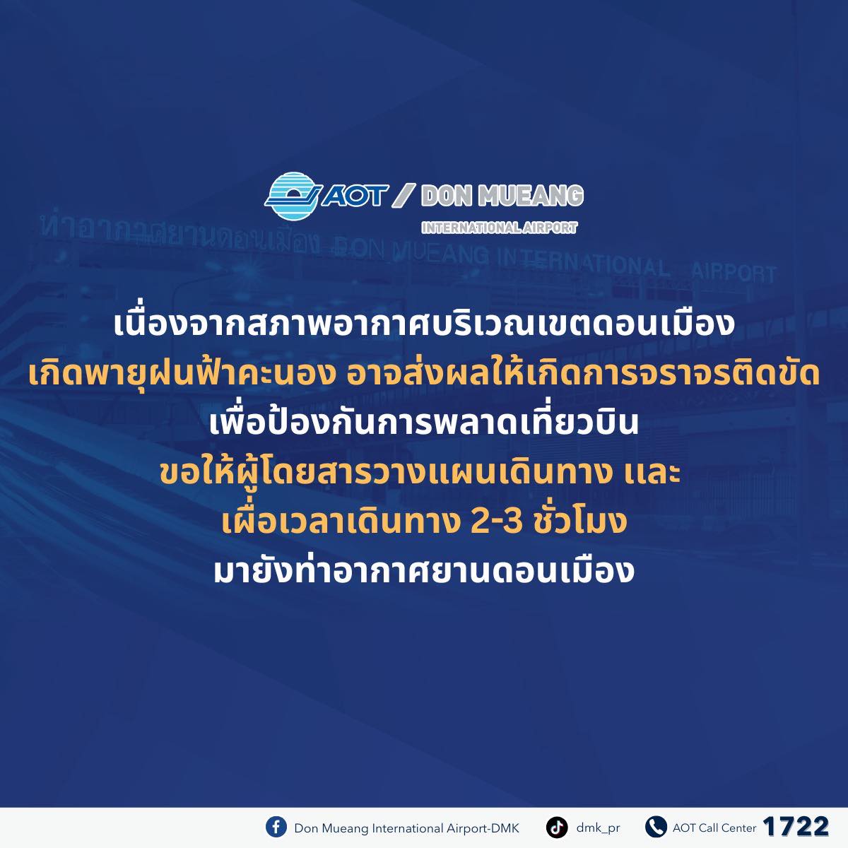 ล่าสุดสนามบินดอนเมือง ได้ประชาสัมพันธ์ ให้ผู้โดยสารเผื่อเวลาในการเดินทาง เนื่องจากพายุฝนฟ้าคะนอง โดยรายละเอียด ระบุว่า "เนื่องจากสภาพอากาศบริเวณเขตดอนเมืองเกิดพายุฝนฟ้าคะนอง อาจส่งผลให้การจราจรติดขัด เพื่อป้องกันการพลาดเที่ยวบิน ขอให้ผู้โดยสารวางแผนการเดินทาง และเผื่อเวลาเดินทาง 2-3 ชั่วโมง มายังท่าอากาศยานดอนเมือง"