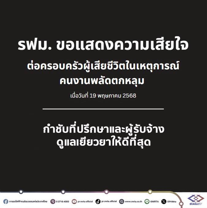 ในการนี้ รฟม. ขอแสดงความเสียใจต่อเหตุการณ์ที่เกิดขึ้นและขอแสดงความห่วงใยแก่ครอบครัวของผู้เสียชีวิต โดยได้สั่งการให้ที่ปรึกษาและผู้รับจ้างดูแลและเยียวยาอย่างเหมาะสมต่อไป พร้อมกันนี้ รฟม. ขอขอบคุณทุกหน่วยงานที่เกี่ยวข้องทั้ง สำนักงานเขตป้อมปราบศัตรูพ่าย สำนักป้องกันและบรรเทาสาธารณภัย กรมป้องกันและบรรเทาสาธารณภัย สถานีตำรวจนครบาลนางเลิ้ง การไฟฟ้านครหลวง การประปานครหลวง มูลนิธิร่วมกตัญญู สถานีดับเพลิงและกู้ภัยภูเขาทอง พร้อมด้วยหน่วยงานที่เกี่ยวข้องทุกท่านที่ปฏิบัติงานอย่างเต็มกำลังความสามารถ รวมถึงประชาชนในพื้นที่ใกล้เคียงที่ได้ส่งกำลังใจและให้ความร่วมมือในการปฏิบัติงานแก่เจ้าหน้าที่ด้วยดี ซึ่งการติดตามค้นหาร่างของผู้เสียชีวิตนั้น มีอุปสรรคค่อนข้างมากเนื่องจากข้อจำกัดของสภาพพื้นที่ ทำให้การค้นหาต้องใช้ความระมัดระวังอย่างมากและต้องมีความปลอดภัยแก่เจ้าหน้าที่ผู้ปฏิบัติงานทุกคน แต่ด้วยความช่วยเหลือและความร่วมมือของทุกภาคส่วน จึงทำให้การดำเนินงานสำเร็จลุล่วง ติดตามข้อมูลข่าวสาร รฟม. เพิ่มเติมได้ที่เว็บไซต์ รฟม. www.mrta.co.th และเฟซบุ๊กแฟนเพจการรถไฟฟ้าขนส่งมวลชนแห่งประเทศไทย หรือ Call Center รฟม. โทรศัพท์ 0 2716 4044