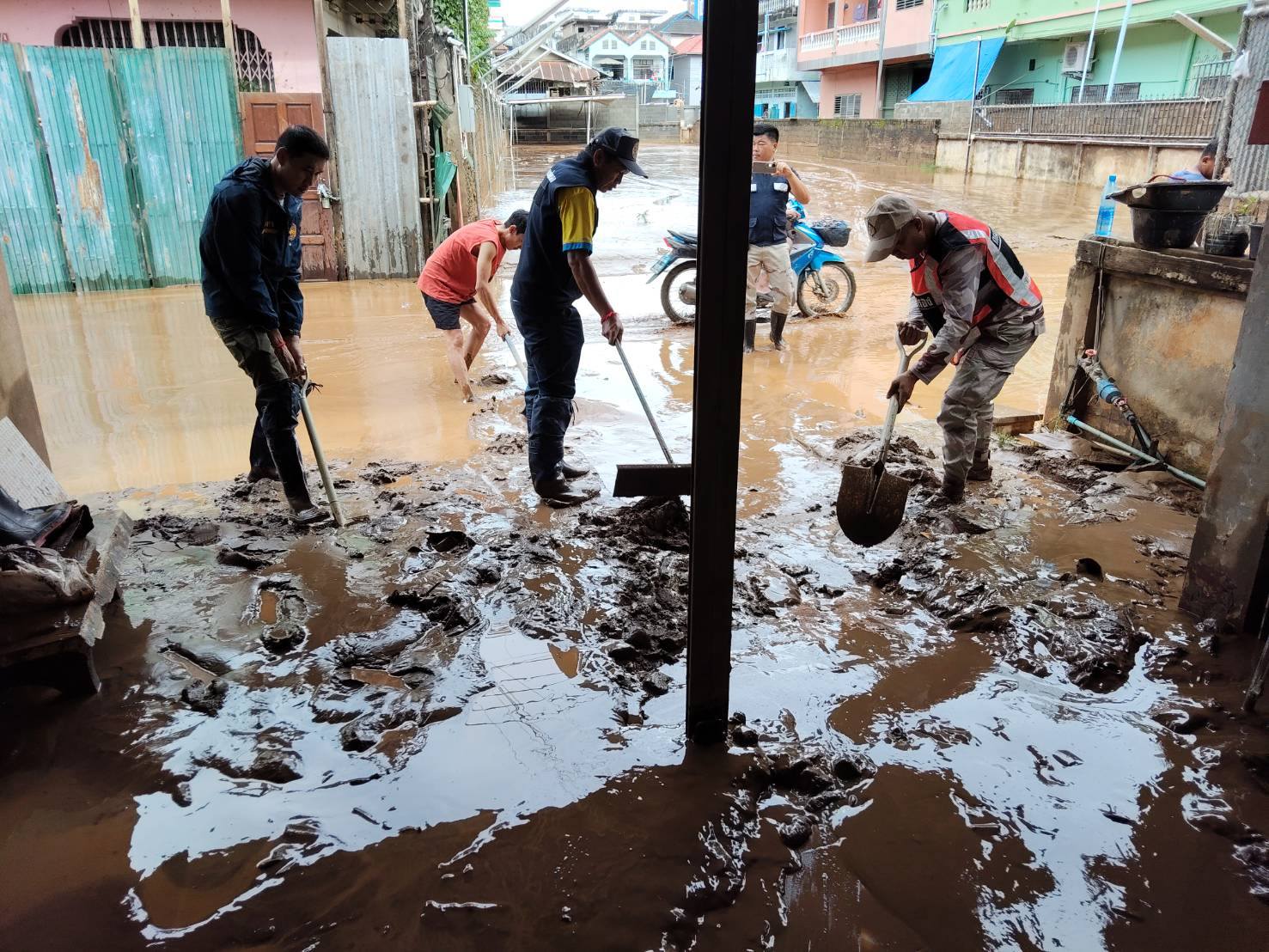 ( 2) ระดับน้ำในชุมชนลดลงอย่างต่อเนื่อง โดยหน่วยทหาร และสมาชิก อส ได้ช่วยทำความสะอาดบ้านเรือนประชาชน และขนย้ายสิ่งของ