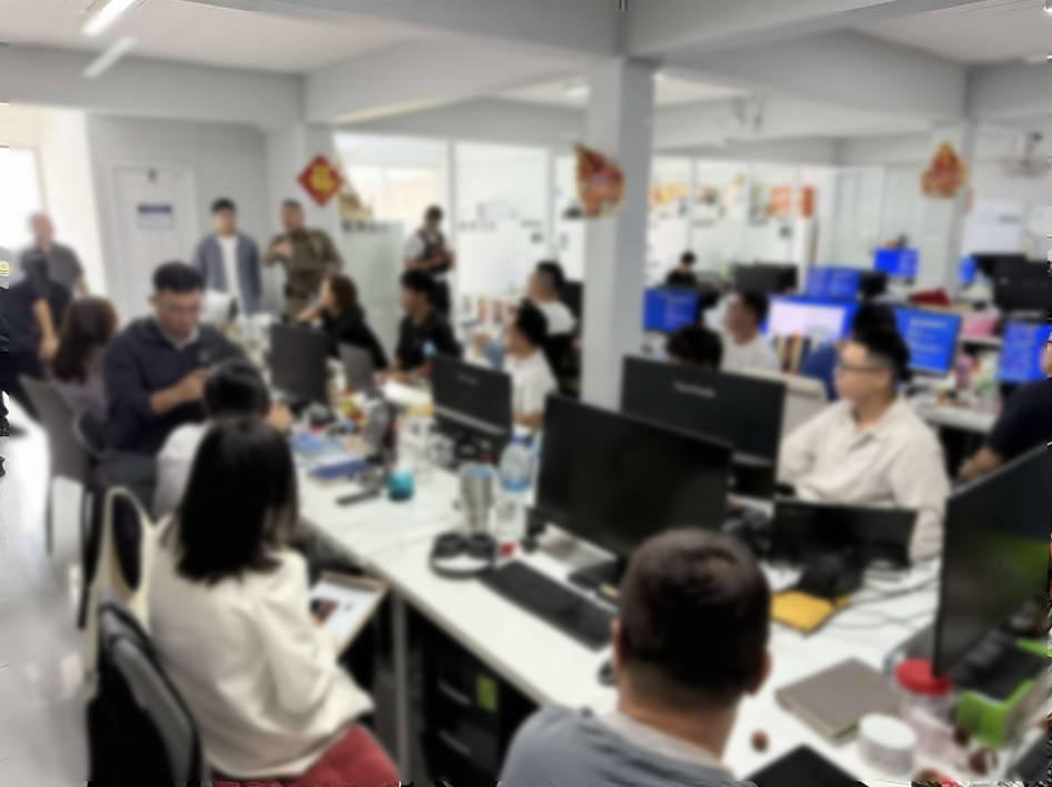 จากการตรวจสอบพบว่าบริษัทดังกล่าว เปิดเป็นสำนักงานซื้อขายบ้านพักที่ดินขนาดใหญ่ ในอาคารพาณิชย์รวม 4 คูหา มีด้วยกันทัังหมด 3 ชั้น ตำรวจจึงอ่านหมายค้นให้ นายคำ (นามสมมุติ) CEO ประธานกรรมบริษัท รับทราบถึงวัตถุประสงค์ จากการกระจายกำลังตรวจโดยตรวจชั้น 1-2 ทำเป็นที่บริการรับรองลูกค้า ส่วนชั้นที่ 3-4 เปิดเป็นออฟฟิศมีด้วยกันหลายแผนก ประกอบด้วยแอดมินฝ่ายบริการด้านทำความสะอาดและซ่อมแซม แอดมินฝ่ายเจาะทรัพย์ ผู้ช่วยเซลส์ และการตลาด โดยมีพนักงานคนไทย-ต่างชาติ จำนวนมาก กำลังนั่งทำงานอยู่หน้าคอมพิวเตอร์ ขณะที่บางส่วนก็กำลังพูดคุยบริการลูกค้า