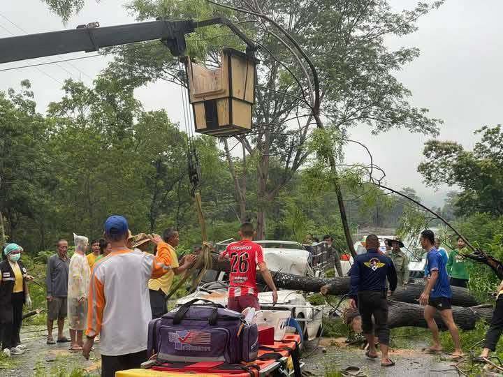 โดยหลังได้รับแจ้งจากชาวบ้านว่ามีเหตุต้นไม้ล้มทับรถยนต์ จึงออตรวจสอบพร้อม พร้อมด้วยกู้ชีพ อบต โชคชัย ที่เกิดเหตุพบต้นไม้ขนาดใหญ่ล้มทับรถกระบะยี่ห้อโตโยต้า สีขาว ทะเบียน มุกดาหาร สภาพห้องโดยสารยุบ ในรถพบผู้เสียชีวิตเป็นคนขับ เป็นชายอายุ 54 ปี ส่วนหญิงที่นั่งข้างเป็นภรรยา อายุ 49 ปี ก็เสียชีวิตเช่นกัน โดย สภาพศีรษะถูกทับ ส่วนลูกสาวอยู่ในแคปด้านหลังคนขับบาดเจ็บไม่มาก