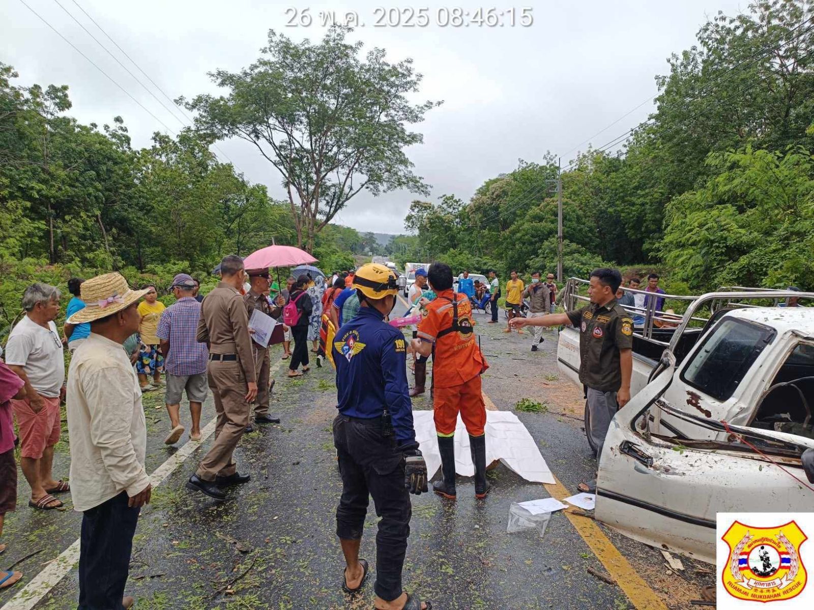 วันจันทร์ที่ 26 พฤษภาคม 2568 เวลา 08.30 น รับแจ้งเหตุต้นไม้ใหญ่ ข้างถนนสาธารณะ สายบ้านหนองนกเขียน - ตำบลโชคชัย อำเภอนิคมคำสร้อย จ.มุกดาหาร หักโค่นทับรถยนต์ ทำให้มีผู้เสียชีวิต จำนวน 2 ราย (ชาย 1ราย หญิง 1 ราย) บาดเจ็บอีก 1 ราย