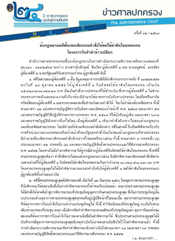 26 พ.ค.2568 สำนักงานศาลปกครอง เผยแพร่ข่าวประชาสัมพันธ์เรื่อง ข้อกฎหมายคดีฟ้องขอเพิกถอนคำสั่งให้ชดใช้ค่าสินไหมทดแทน โครงการรับจำนำข้าวเปลือก เนื้อหาระบุ สำนักงานศาลปกครองขอชี้แจงข้อกฎหมายในการดำเนินกระบวนพิจารณาคดีหมายเลขแดงที่ อผ.160-163/2568 ระหว่าง นางสาวยิ่งลักษณ์ ชินวัตร ผู้ฟ้องคดีที่ 1 และ นายอนุสรณ์ อมรฉัตร ผู้ฟ้องคดีที่ 2 นายกรัฐมนตรีกับพวกรวมเก้าคน ผู้ถูกฟ้องคดี ดังนี้