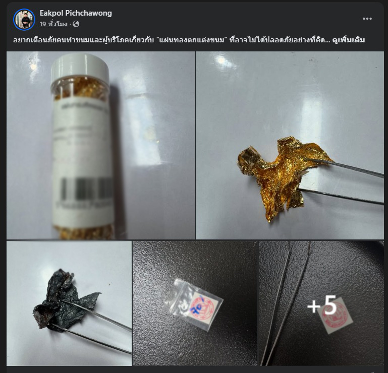 โดย ระบุว่า "อยากเตือนภัยคนทำขนมและผู้บริโภคเกี่ยวกับ “แผ่นทองตกแต่งขนม” ที่อาจไม่ได้ปลอดภัยอย่างที่คิด