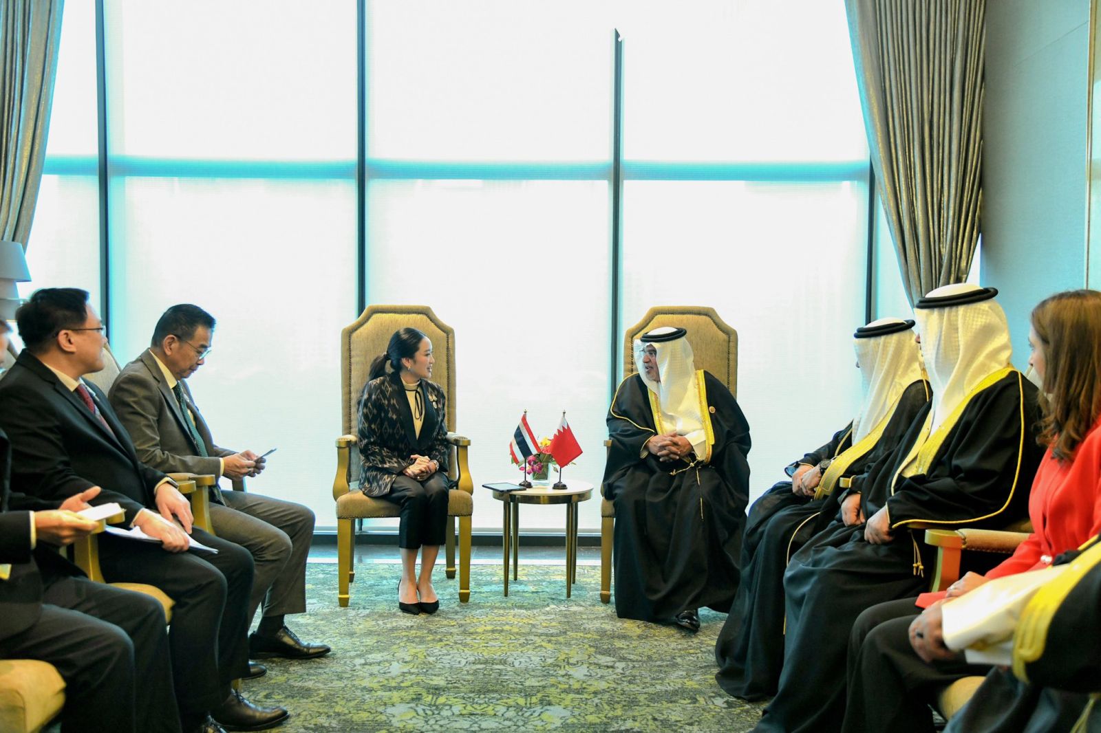 นายกรัฐมนตรีกล่าวแสดงความยินดีที่ได้เข้าเฝ้าฯ มกุฎราชกุมารและนายกรัฐมนตรีแห่งราชอาณาจักรบาห์เรน ทั้งนี้ บาห์เรนถือเป็นพันธมิตรที่ใกล้ชิดและสำคัญในตะวันออกกลาง มกุฎราชกุมารและนายกรัฐมนตรีแห่งราชอาณาจักรบาห์เรน ชื่นชมความสัมพันธ์ ไทย - บาห์เรน โดยทั้งสองฝ่ายยังได้มีการแลกเปลี่ยนความคิดเห็นสถานการณ์ต่าง ๆ อาทิ ภาษีศุลากรระดับสูงของสหรัฐฯ เป็นต้น