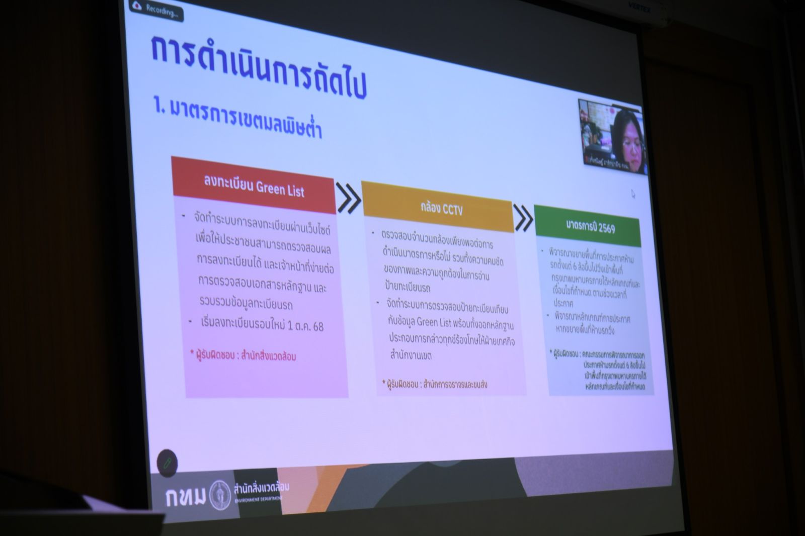 ด้านผลการดำเนินงานในการป้องกันและแก้ไขปัญหาฝุ่น PM2.5 ในปี 2568 ได้แก่ LEZ กรุงเทพมหานครมีการประกาศห้ามรถบรรทุกตั้งแต่ 6 ล้อ (ยกเว้น EV, NGV, EURO 5-6) ที่ไม่ได้ขึ้นทะเบียนบัญชีสีเขียว เข้าในพื้นที่เขตควบคุมฝุ่นวงแหวนรัชดาภิเษก ในช่วงวิกฤตฝุ่น ในวันพฤหัสบดีที่ 23 ม.ค. 68 เวลา 00.01 น. ถึงวันศุกร์ที่ 24 ม.ค. 68 เวลา 23.59 น. ดำเนินการร้องทุกข์กล่าวโทษแล้ว 426 คัน พนักงานสอบสวนเปรียบเทียบปรับแล้ว 4 คดี ทั้งนี้ ตั้งแต่วันที่ 29 ต.ค. 67 – 31 มี.ค. 68 มีรถตั้งแต่ 6 ล้อขึ้นไปลงทะเบียนบัญชีสีเขียวแล้วทั้งสิ้น 57,936 คัน โดยในปี 2569 จะพิจารณาขยายพื้นที่การประกาศห้ามรถตั้งแต่ 6 ล้อขึ้นไปวิ่งเข้าพื้นที่กรุงเทพมหานคร