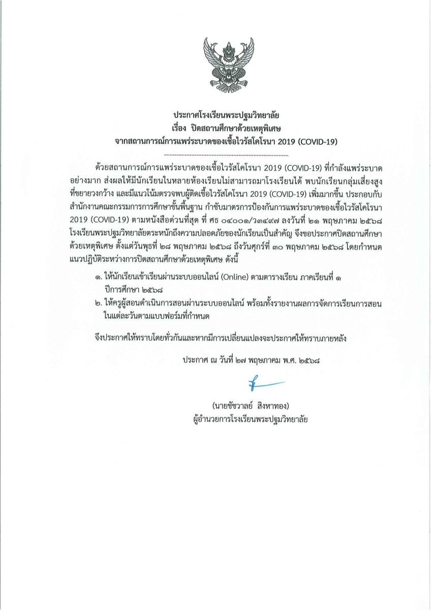 โรงเรียนพระปฐมวิทยาลัย จังหวัดนครปฐม ได้ออกประกาศปิดสถานศึกษาชั่วคราว เนื่องจากสถานการณ์การแพร่ระบาดของเชื้อไวรัสโคโรนา 2019 (COVID-19) ที่ทวีความรุนแรงและแพร่กระจายอย่างรวดเร็ว ส่งผลให้นักเรียนในหลายท้องที่ไม่สามารถเดินทางมาเรียนได้ โดยเฉพาะในกลุ่มนักเรียนที่อยู่ในพื้นที่เสี่ยงและยังไม่ได้รับการตรวจหาเชื้อ