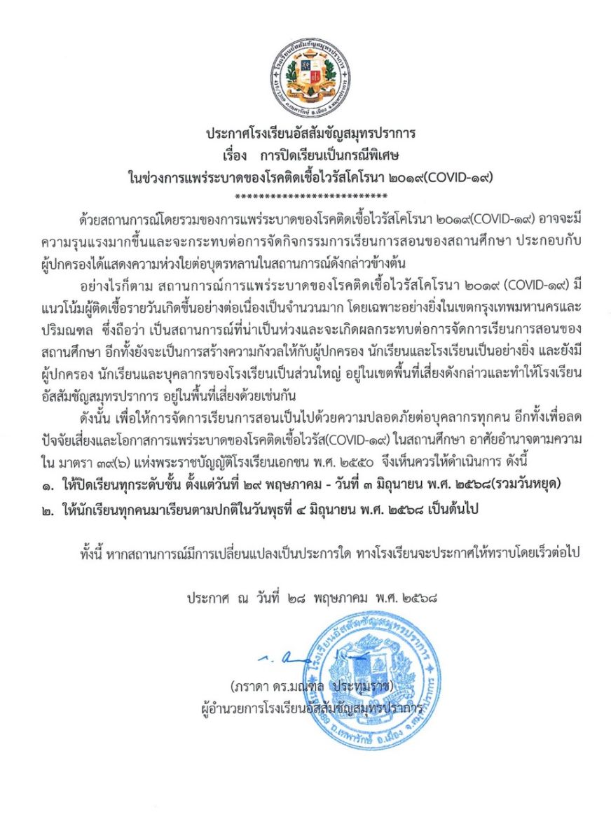28 พฤษภาคม 2568 โรงเรียนอัสสัมชัญสมุทรปราการ ออกประกาศ เรื่อง การปิดเรียนเป็นกรณีพิเศษ ในช่วงการแพร่ระบาดของโรคติดเชื้อไวรัสโคโรนา 2019 (COVID-19)