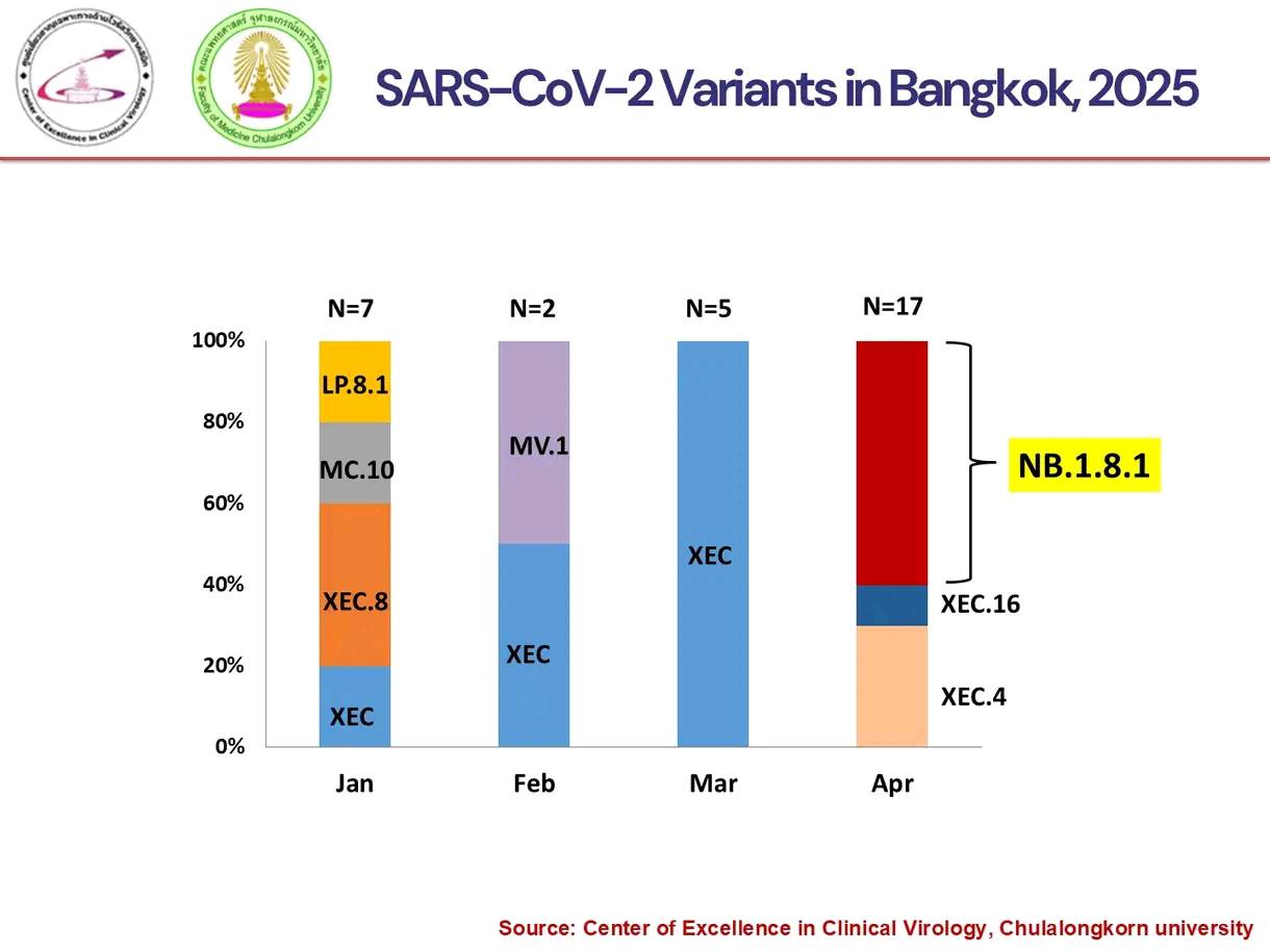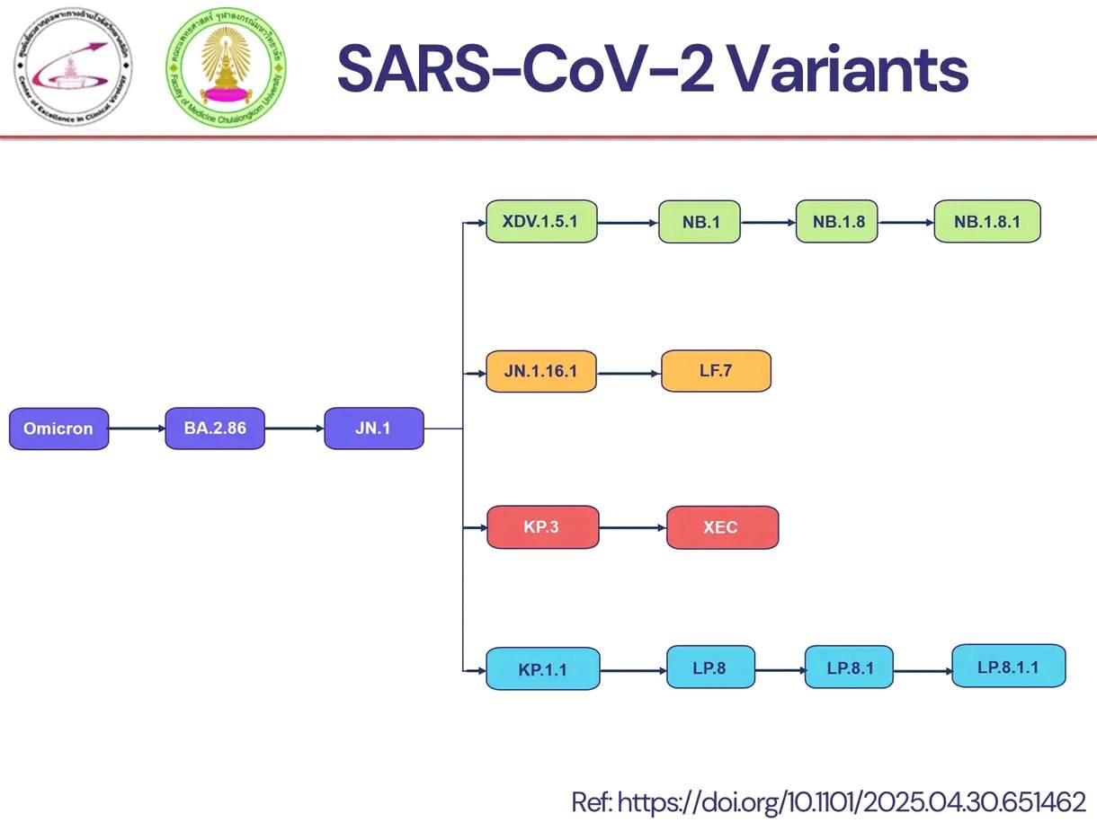 โดยทำการศึกษาที่ศูนย์ของเรา ส่วนใหญ่เป็นในเขตกรุงเทพฯ สายพันธุ์ที่พบ เป็นสายพันธุ์ล่าสุด คือ NB.1.8.1 เป็นสายพันธุ์ที่ทันสมัยกำลังจะระบาดใหญ่ทั่วโลก โดย สายพันธุ์นี้ถ้าดูตามรูปจะเป็นลูกหลานเหลนโหลน ของ XDV ส่วน XDV ก็เป็นเหลนของโอมิครอน ไม่ได้แตกลูกหลานจากสายพันธุ์ XEC ที่ระบาดมาก่อนหน้านี้