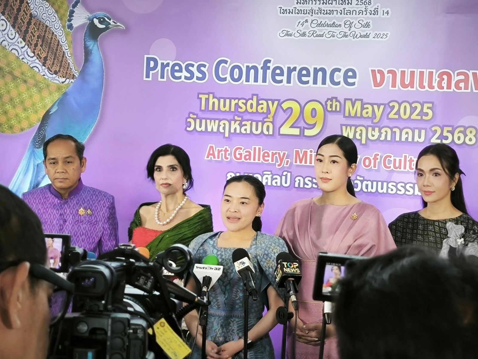 29 พฤษภาคม 2568 นางสาวสุดาวรรณ หวังศุภกิจโกศล รัฐมนตรีว่ากระทรวงวัฒนธรรม เป็นประธานงานแถลงข่าว “มหกรรมผ้าไหม ไหมไทยสู่เส้นทางโลก ครั้งที่ 14” และโครงการประกวด The 6th Next Big Silk Designer Contest 2025 โดยมีนายประสพ เรียงเงิน ปลัดกระทรวงวัฒนธรรม ดร.สุมาลี อุทัยเฉลิม ประธานกิตติมศักดิ์สมาคมส่งเสริมผ้าไหมและวัฒนธรรมไทย ผู้บริหารกระทรวงวัฒนธรรม กระทรวงการอุดมศึกษา วิทยาศาสตร์ วิจัยและนวัตกรรม กรมประชาสัมพันธ์ การท่องเที่ยวแห่งประเทศไทย สถานเอกอัครราชทูตต่างประเทศประจำประเทศไทย สำนักงานคณะกรรมการการอาชีวศึกษา หน่วยงานรัฐ เอกชน ข้าราชการและเจ้าหน้าที่กระทรวงวัฒนธรรมและสื่อมวลชน เข้าร่วม ณ ห้อง Gallery 5 หอศิลป์แห่งชาติ กระทรวงวัฒนธรรม