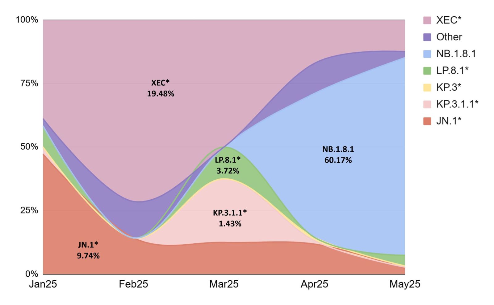• XEC*: จำนวนผู้ติดเชื้อค่อนข้างคงที่ในช่วงเดือนมกราคมถึงเมษายนแต่เพิ่มขึ้นเล็กน้อยในเดือนพฤษภาคม