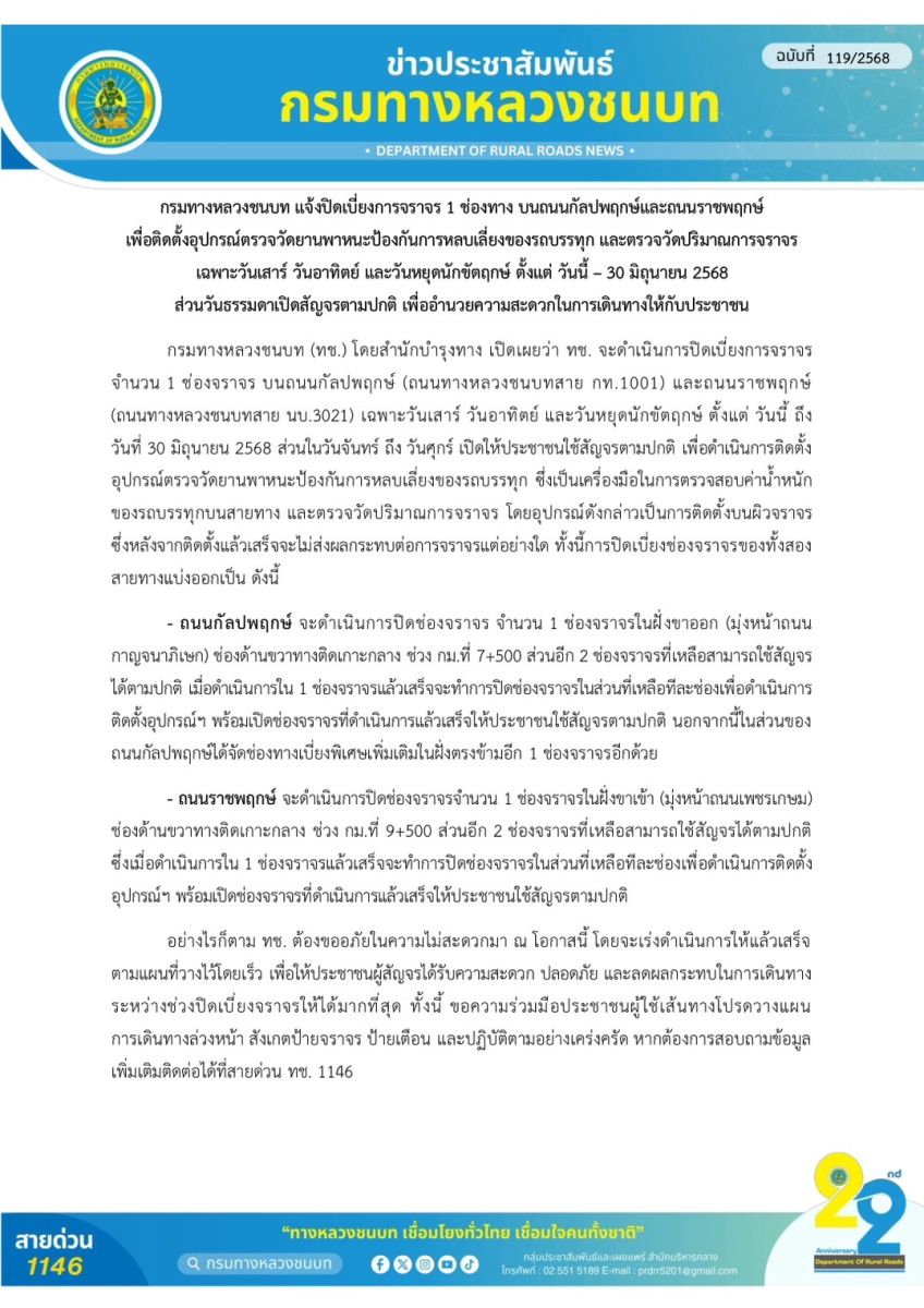 กรมทางหลวงชนบท แจ้งปิดเบี่ยงการจราจร 1 ช่องทาง บนถนนกัลปพฤกษ์และถนนราชพฤกษ์ เพื่อติดตั้งอุปกรณ์ตรวจวัดยานพาหนะป้องกันการหลบเลี่ยงของรถบรรทุก และตรวจวัดปริมาณการจราจร เฉพาะวันเสาร์ วันอาทิตย์ และวันหยุดนักขัตฤกษ์ ตั้งแต่ วันนี้ – 30 มิถุนายน 2568 ส่วนวันธรรมดาเปิดสัญจรตามปกติ เพื่ออำนวยความสะดวกในการเดินทางให้กับประชาชน