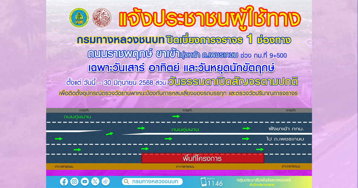 กรมทางหลวงชนบท แจ้งปิดเบี่ยงการจราจร ถนนกัลปพฤกษ์และถนนราชพฤกษ์ เพื่อติดตั้งอุปกรณ์ตรวจวัดยานพาหนะ 29 พ.ค. - 30 มิ.ย.68