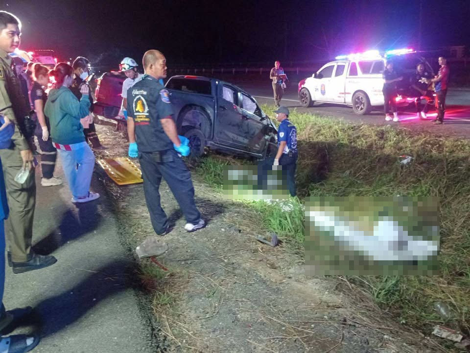 ที่เกิดเหตุ พบรถกระบะ 4 ประตู อีซูซุ วีครอส สีเทา ทะเบียน 2074 ชลบุรี สภาพพังยับทั้งคัน ร่องรอยล้อรถยาวกว่า 200 เมตรก่อนตกลงร่องกลางถนน จากการตรวจสอบ พบว่ามีผู้เสียชีวิต 2 ราย เป็นหญิงไทย อายุ 35 ปี และเด็กหญิง วัยประมาณ 5 ขวบ ซึ่งคาดว่าเป็นแม่และลูกสาว เสียชีวิตในพงหญ้ากลางถนน และพบว่ามีผู้บาดเจ็บ 2 รายคือ เป็นชายไทย คนขับรถกระบะ และเด็กชาย วัยประมาณ 8 ขวบ คาดว่าเป็นพ่อและลูกชาย เจ้าหน้าที่กู้ภัยรีบนำส่งโรงพยาบาล