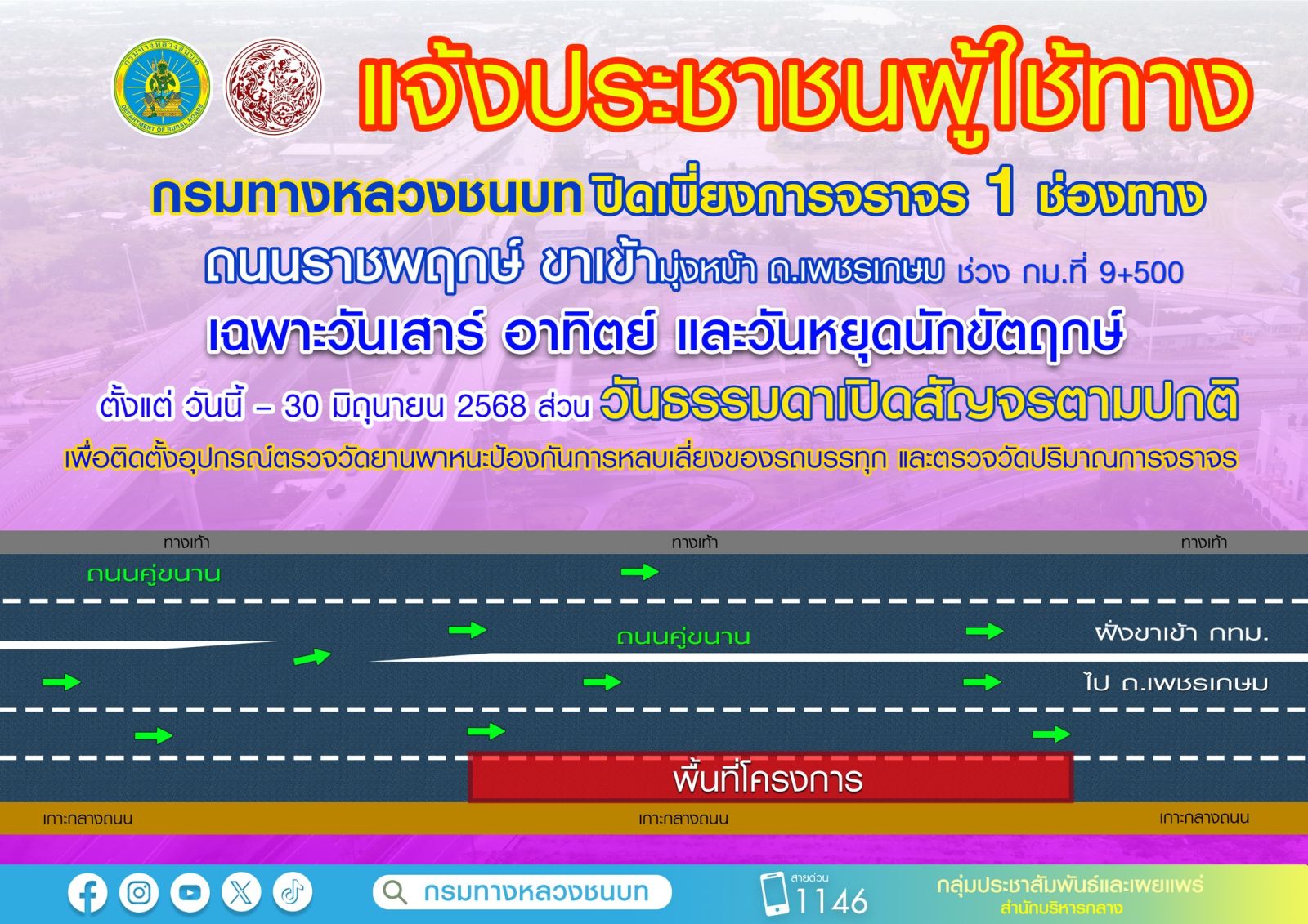 กรมทางหลวงชนบท แจ้งปิดเบี่ยงการจราจร 1 ช่องทาง บนถนนกัลปพฤกษ์และถนนราชพฤกษ์ เพื่อติดตั้งอุปกรณ์ตรวจวัดยานพาหนะป้องกันการหลบเลี่ยงของรถบรรทุก และตรวจวัดปริมาณการจราจร เฉพาะวันเสาร์ วันอาทิตย์ และวันหยุดนักขัตฤกษ์ ตั้งแต่ วันนี้ – 30 มิถุนายน 2568 ส่วนวันธรรมดาเปิดสัญจรตามปกติ เพื่ออำนวยความสะดวกในการเดินทางให้กับประชาชน