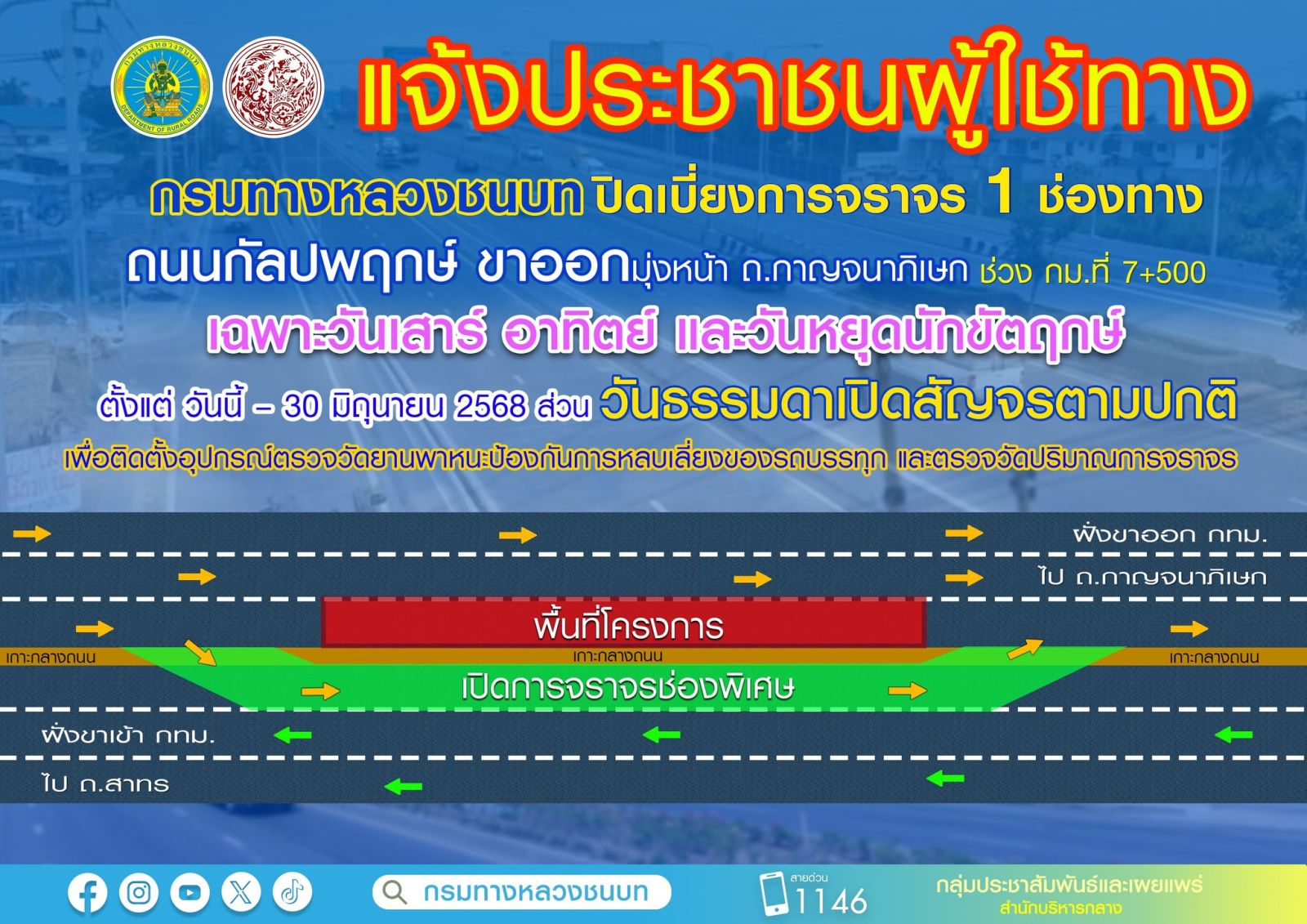 กรมทางหลวงชนบท แจ้งปิดเบี่ยงการจราจร 1 ช่องทาง บนถนนกัลปพฤกษ์และถนนราชพฤกษ์ เพื่อติดตั้งอุปกรณ์ตรวจวัดยานพาหนะป้องกันการหลบเลี่ยงของรถบรรทุก และตรวจวัดปริมาณการจราจร เฉพาะวันเสาร์ วันอาทิตย์ และวันหยุดนักขัตฤกษ์ ตั้งแต่ วันนี้ – 30 มิถุนายน 2568 ส่วนวันธรรมดาเปิดสัญจรตามปกติ เพื่ออำนวยความสะดวกในการเดินทางให้กับประชาชน