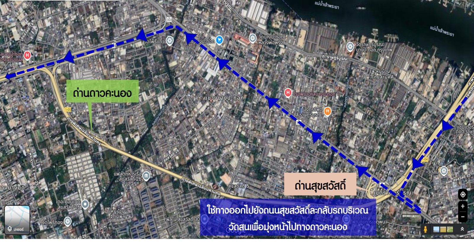 สำหรับรถที่จะไปพระราม2-ดาวคะนอง ใช้ทางออกไปยังถนนสุขสวัสดิ์ และกลับรถบริเวณวัดสน เพื่อมุ่งหน้าไปดาวคะนองทดแทน