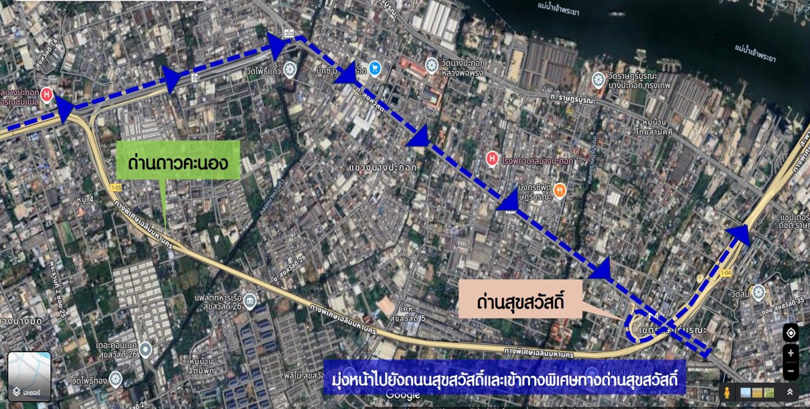 สำหรับรถที่จะใช้ทางพิเศษเฉลิมมหานคร ให้มุ่งหน้าถนนสุขสวัสดิ์ และใช้ด่านฯ สุขสวัสดิ์ทดแทน
