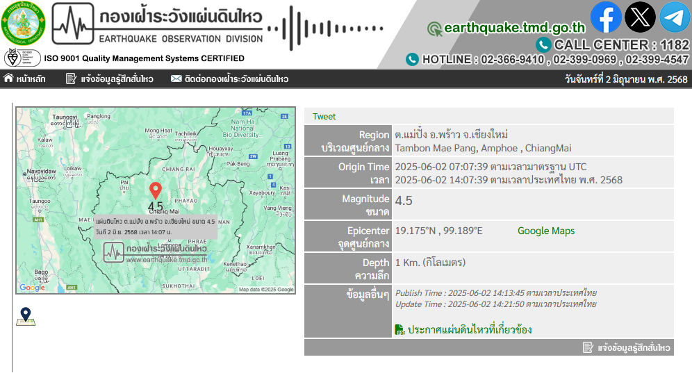 2 มิถุนายน 2568 รายงานจากกองเฝ้าระวังแผ่นดินไหว กรมอุตุนิยมวิทยา พื้นที่ ต.แม่ปั๋ง อ.พร้าว จ.เชียงใหม่ เวลา 14:07:39 ตามเวลาประเทศไทย แผ่นดินไหว ขนาด 4.5 ลึก 1 กิโลเมตร