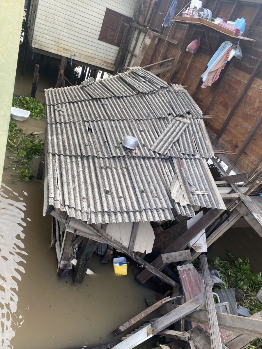 ผู้สื่อข่าวลงพื้นที่ ตรวจสอบพบว่าจุดที่ถล่มลงมาเป็นห้องที่ผู้บาดเจ็บอาศัยอยู่ มีความยาว 6 เมตร กว้าง 3 เมตร ตัวคานหลังคาด้านบนของ จั่วมีร่องรอยไม้ฉีกขาด มีเศษกองไม้ หลังคาจำนวนมากลงไปกองอยู่ในแม่น้ำ เจ้าหน้าที่ ป้องกันและบรรเทาสาระภัยเทศบาลนครนนทบุรี และนายรังสรรค์ อายุ 70 ปี พี่ชายของผู้บาดเจ็บ กำลังรื้อโครงสร้างออกเพื่อป้องกันการดึงตัวบ้านที่เหลือซ้ำ