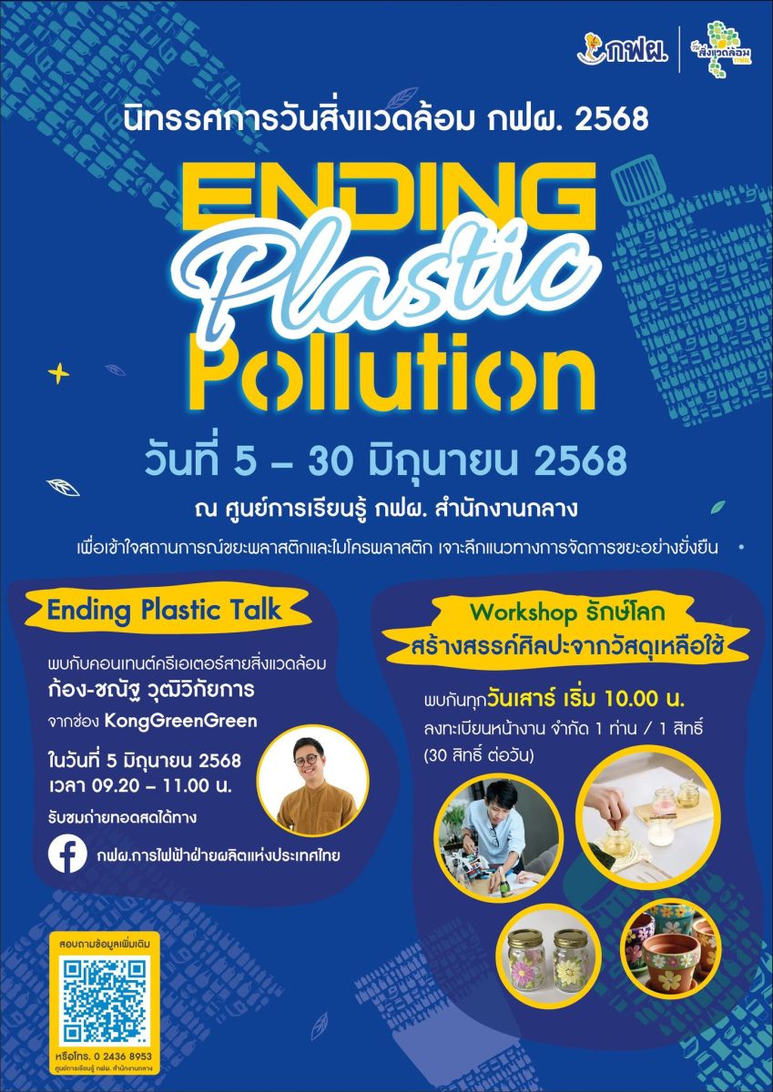 กฟผ. ขอเชิญร่วมงานวันสิ่งแวดล้อม กฟผ. 2568 "Ending Plastic Pollution" ร่วมเรียนรู้เรื่องปัญหาขยะพลาสติกและไมโครพลาสติก พร้อมเจาะลึกแนวทางการจัดการขยะอย่างยั่งยืน ผ่านนิทรรศการที่ให้ความรู้ และกิจกรรม "Ending Plastic Talk" โดย ก้อง-ชณัฐ วุฒิวิกัยการ คอนเทนต์ครีเอเตอร์สายสิ่งแวดล้อม เจ้าของช่อง KongGreenGreen ในเวลา 09.00 – 11.00 น. พร้อมด้วย Workshop สร้างสรรค์ศิลปะจากวัสดุเหลือใช้สุดรักษ์โลกในทุกวันเสาร์เวลา 10.00 น. ระหว่างวันที่ 5 - 30 มิถุนายนนี้ ณ ศูนย์การเรียนรู้ กฟผ. สำนักงานกลาง อ.บางกรวย จ.นนทบุรี