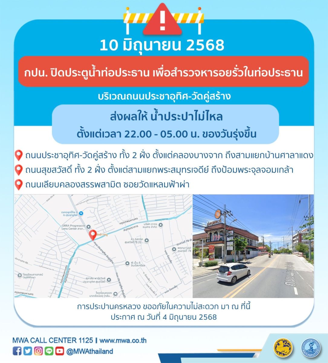 การประปานครหลวง (กปน.) มีความจำเป็นต้องปิดประตูน้ำท่อประธานขนาดเส้นผ่านศูนย์กลาง 1,000 มิลลิเมตร เพื่อสำรวจหารอยรั่วในท่อประธาน ถนนประชาอุทิศ-วัดคู่สร้าง ในคืนวันอังคารที่ 10 มิถุนายน 2568 ตั้งแต่เวลา 22.00 - 05.00 น. ของวันรุ่งขึ้น เพื่อให้ประชาชนได้รับบริการน้ำประปาอย่างเพียงพอและทั่วถึง โดยระหว่างดำเนินการ ส่งผลให้ น้ำประปาไม่ไหล ในพื้นที่ดังต่อไปนี้