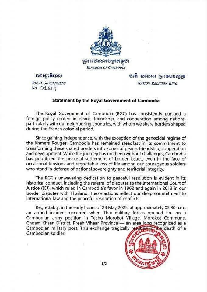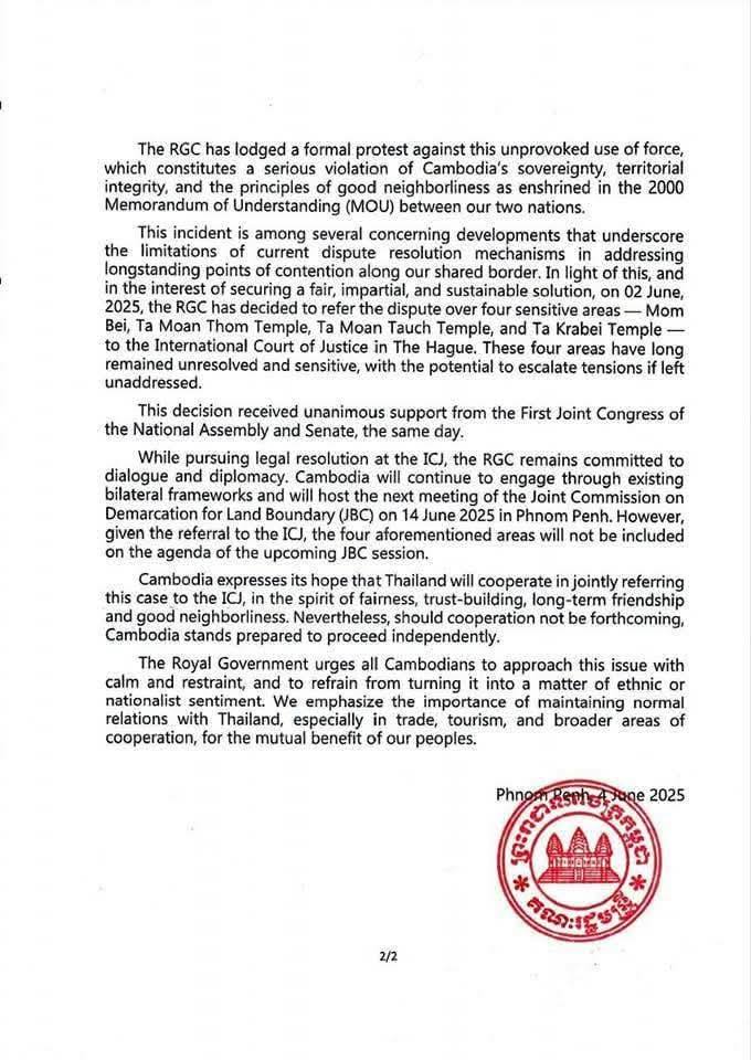 วันนี้ (5 มิ.ย.68) รัฐบาลกัมพูชา ออกแถลงการณ์อย่างเป็นทางการ ประกาศจะไม่เข้าร่วมการประชุมคณะกรรมาธิการเขตแดนร่วมไทย-กัมพูชา (JBC) ซึ่งมีกำหนดจัดขึ้นในวันที่ 14 มิ.ย.68 ที่กรุงพนมเปญ พร้อมยืนยันเดินหน้าขอยื่นเรื่องต่อศาลยุติธรรมระหว่างประเทศ (ICJ) เพื่อให้พิจารณาข้อพิพาทพื้นที่ชายแดนที่ยังคงเป็นประเด็นความขัดแย้งระหว่างสองประเทศ