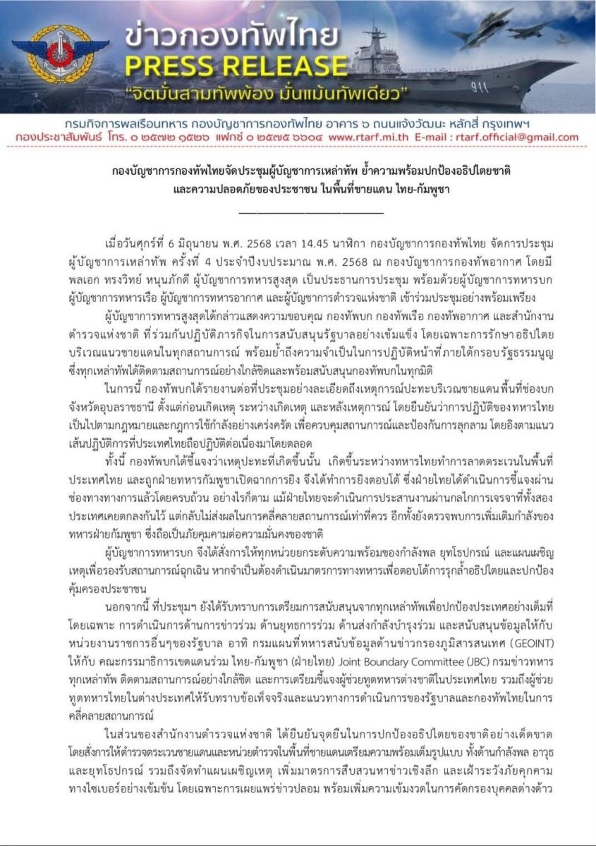 ในช่วงท้ายของการประชุมฯ กองบัญชาการกองทัพไทย กองทัพเรือ กองทัพอากาศ และสำนักงานตำรวจแห่งชาติ ได้แสดงเจตนารมณ์ร่วมกันอย่างชัดเจนในการสนับสนุนภารกิจของกองทัพบกอย่างเต็มขีดความสามารถ ทั้งในด้านการวางแผน การปฏิบัติการ และการประสานงานกับทุกภาคส่วน เพื่อธำรงไว้ซึ่งเอกราช อธิปไตย และเกียรติภูมิของชาติไทย พร้อมทั้งเน้นย้ำความสำคัญของการดำเนินงานภายใต้หลักสากล การรักษาสันติภาพ และเสถียรภาพของภูมิภาค