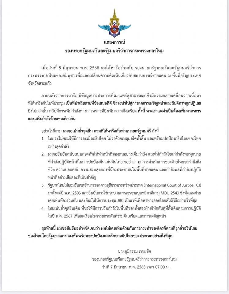 เมื่อวันที่ 5 มิถุนายน พ.ศ. 2568 ผมได้หารือร่วมกับ รองนายกรัฐมนตรีและรัฐมนตรีว่าการกระทรวงกลาโหมของกัมพูชา เพื่อแลกเปลี่ยนความคิดเห็นเกี่ยวกับสถานการณ์ชายแดน ณ พื้นที่อรัญประเทศ จังหวัดสระแก้ว