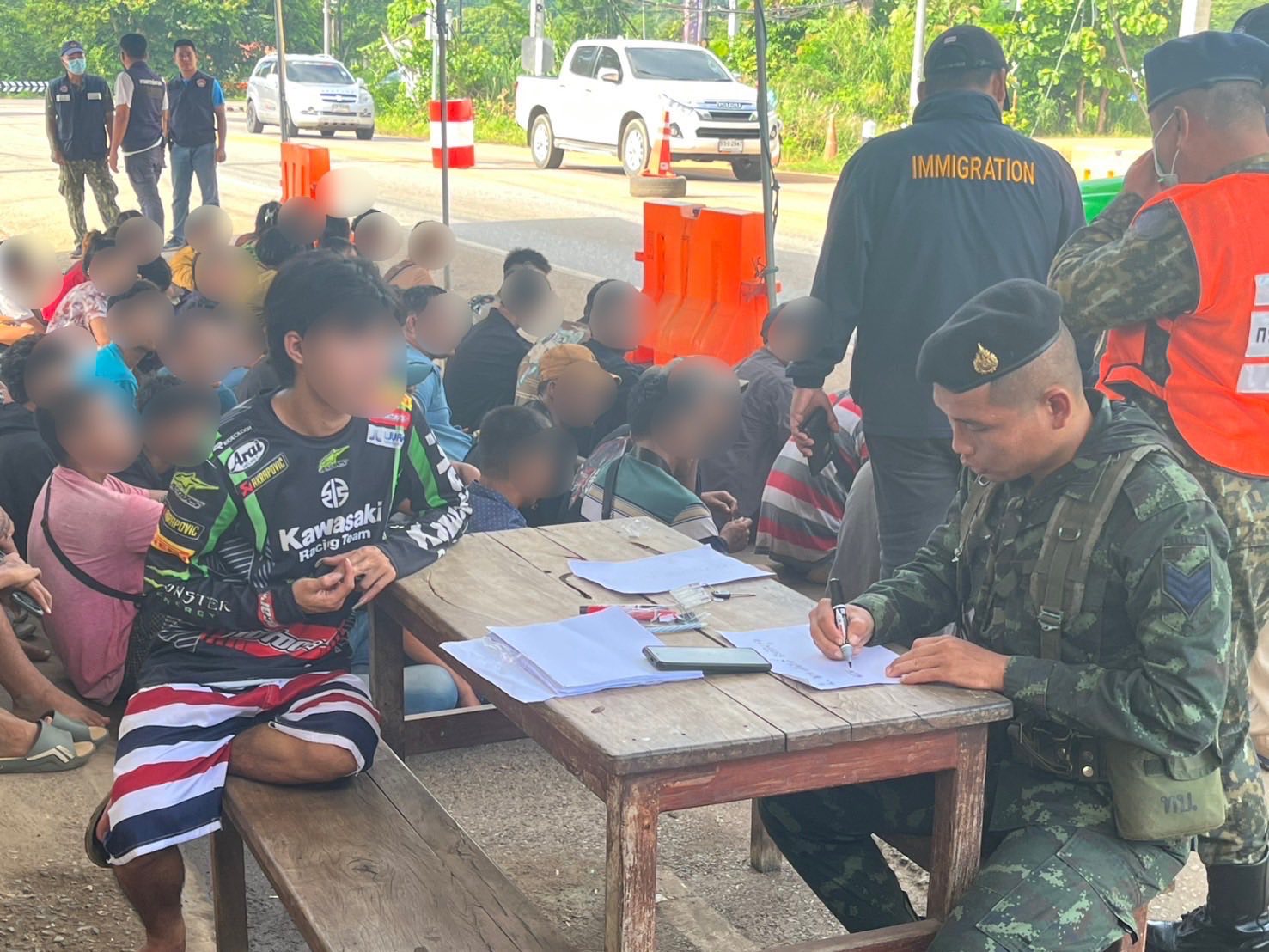 จากการซักถาม ชายอายุ 23 ปี ให้การว่า แรงงานต่างด้าวผิดกฎหมายกลุ่มดังกล่าว เดินทางมาจาก อ.พญาตองซู ประเทศเมียนมา ต้องการเข้ามาทำงานในประเทศไทย จึงได้จ่ายค่าจ้างให้กับนายหน้า จำนวน 10,000 - 15,000 บาท (จ่ายเมื่อถึงปลายทาง) เพื่อเป็นค่าจ้างนำพาหลบหนีเข้ามาทำงานในพื้นที่ตอนใน โดยกลุ่มต่างด้าวผิดกฎหมายเดินเท้าจาก บ้านบ่อญี่ปุ่น มาตามเส้นทางอ้อมหลังจุดตรวจร่วมน้ำเกริ๊ก ม.9 ต.หนองลู อ.สังขละบุรี จ.กาญจนบุรี จากนั้นมีบุคคลไม่ทราบชื่อขับรถยนต์มารับไปส่งยังจุดลงเรือ บริเวณ ท่าเรือ ซอย 4 บ.ดงสัก ต.หนองลู อ.สังขละบุรี และขึ้นฝั่งที่ บ.เกริงกระเวีย ม.4 ต.ท่าขนุน อ.ทองผาภูมิ จากนั้นนายอดิศักดิ์ฯ ขับรถยนต์กระบะตู้ทึบคันที่ถูกจับกุม มารับกลุ่มต่างด้าวผิดกฎหมาย เพื่อไปส่งในพื้นที่ อ.เมืองกาญจนบุรี แต่เจ้าหน้าที่ฝ่ายความมั่นคงสามารถจับกุมได้เสียก่อน จึงได้ทำการส่งตัวผู้กระทำความผิดทั้ง 49 คน พร้อมของกลาง ส่งให้ สภ.ทองผาภูมิ เพื่อดำเนินการตามกฎหมายต่อไป